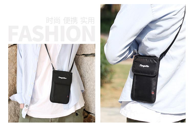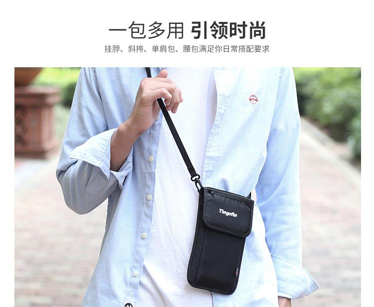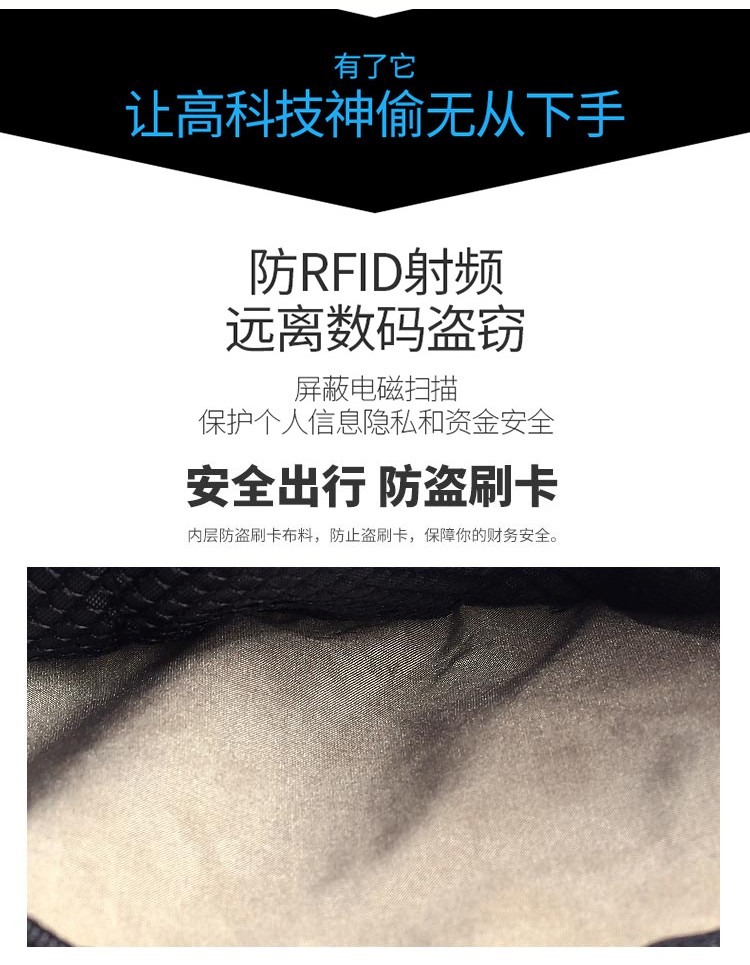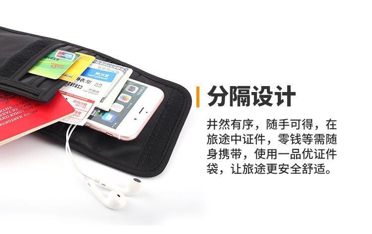 经常出差,带上这款袋子应该很安全。它有分格设计,即能放手机,还可以放银行卡,我最满意的是它能够防射频,远离数码盗窃,让大家安全出行。商家还设计了小挂带,一包多用,很实用且时尚。