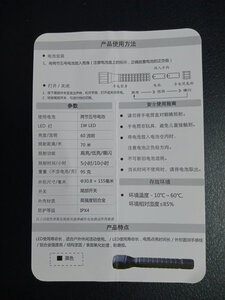 产品材质:采用高强度铝合金,手感防滑 光照强度:很好,光挺强挺亮的 续航时间:还没试呢 产品重量:95克不含电池 电源类型:LED灯,两节五号电池, 其他特色:一直打算买个用电池的手电筒,今天终于如愿以偿了,现在大部分手电筒都是充电的,买个两节五号电池的手电筒备用,赶上没有电的时候可以应急,但愿别用上,用上了就是有灾难了,这款手电性价比很高,快递服务态度好发货也很快,推荐大家购买