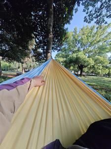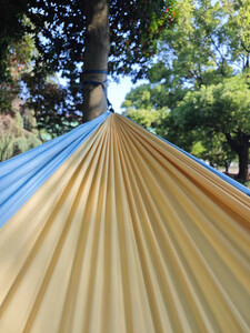 买的吊床到货啦!质量超出预期,布料厚实耐磨, 绳子也很结实,承重完全没问题~周末出门挂树上,晃悠着晒太阳太舒服了!很轻便,易收纳。贴心的设计了收纳袋一体式,不易遗失,太方便了。