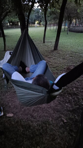 特别小巧,很方便携带。布料摸着也很舒服,感觉应该很透气吧。 颜色很好看,也不会很召小飞虫。承重2个人没问题,躺着很舒服,随便找个树就能绑,特别好操作,优哉游哉。