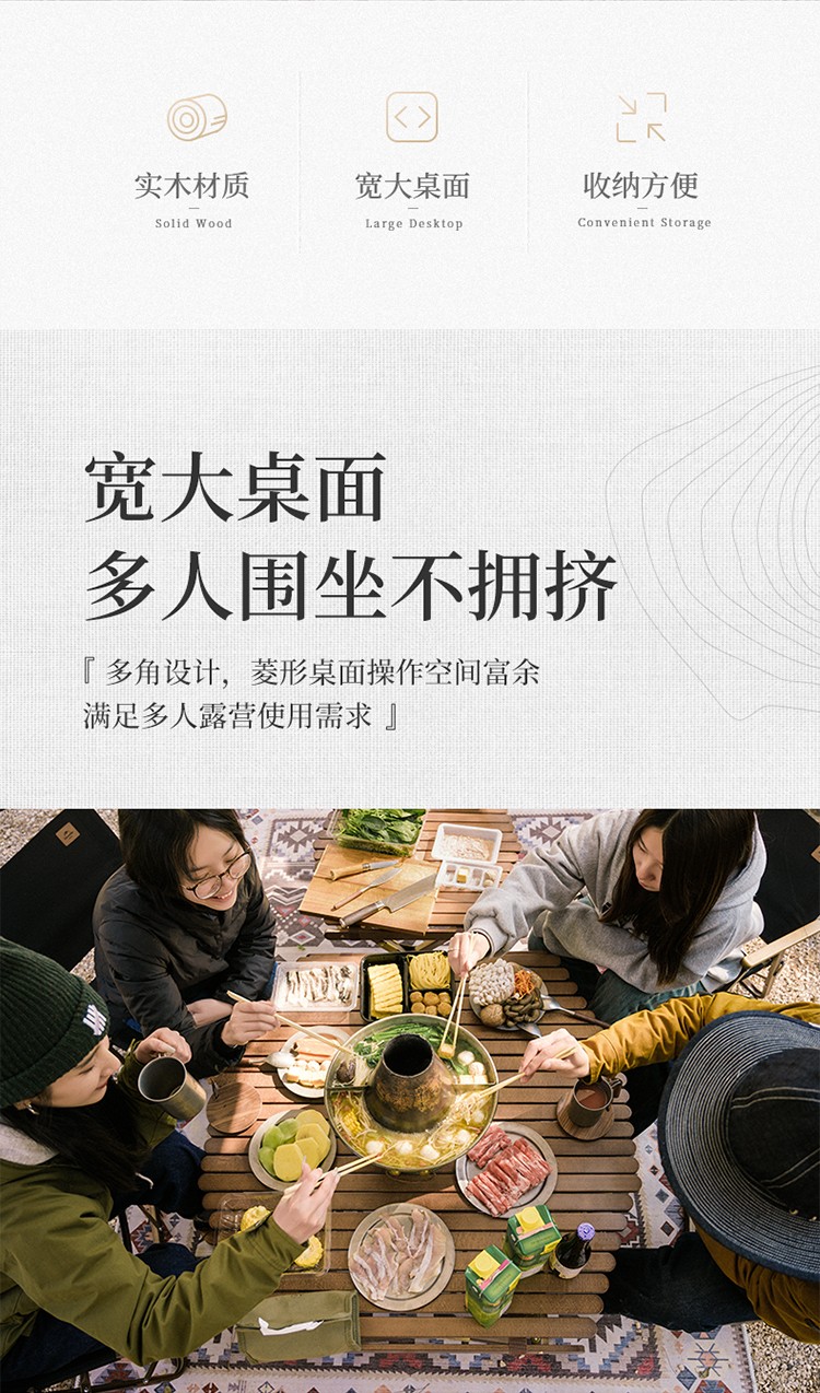 价格实惠,太实惠了,这么大一个实木桌子,也不过百十块钱。质感一流,如果不是考虑重量,搬家式露营的话,这一款桌子可以围坐六个人大牌吃饭火锅烤肉都很好,记得铺一片桌布,毕竟实木的,撒上油水不太好打理