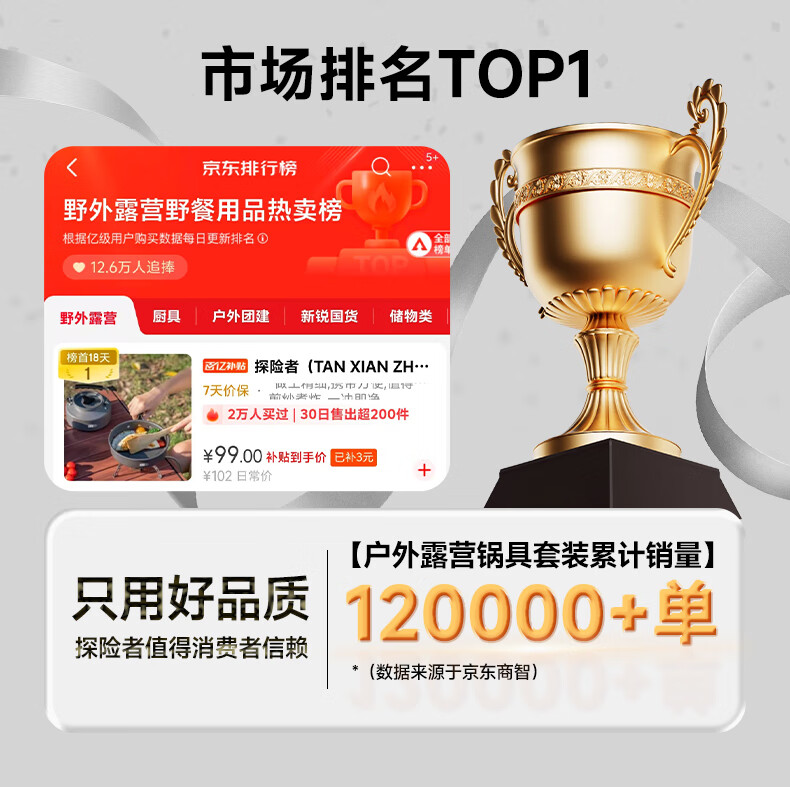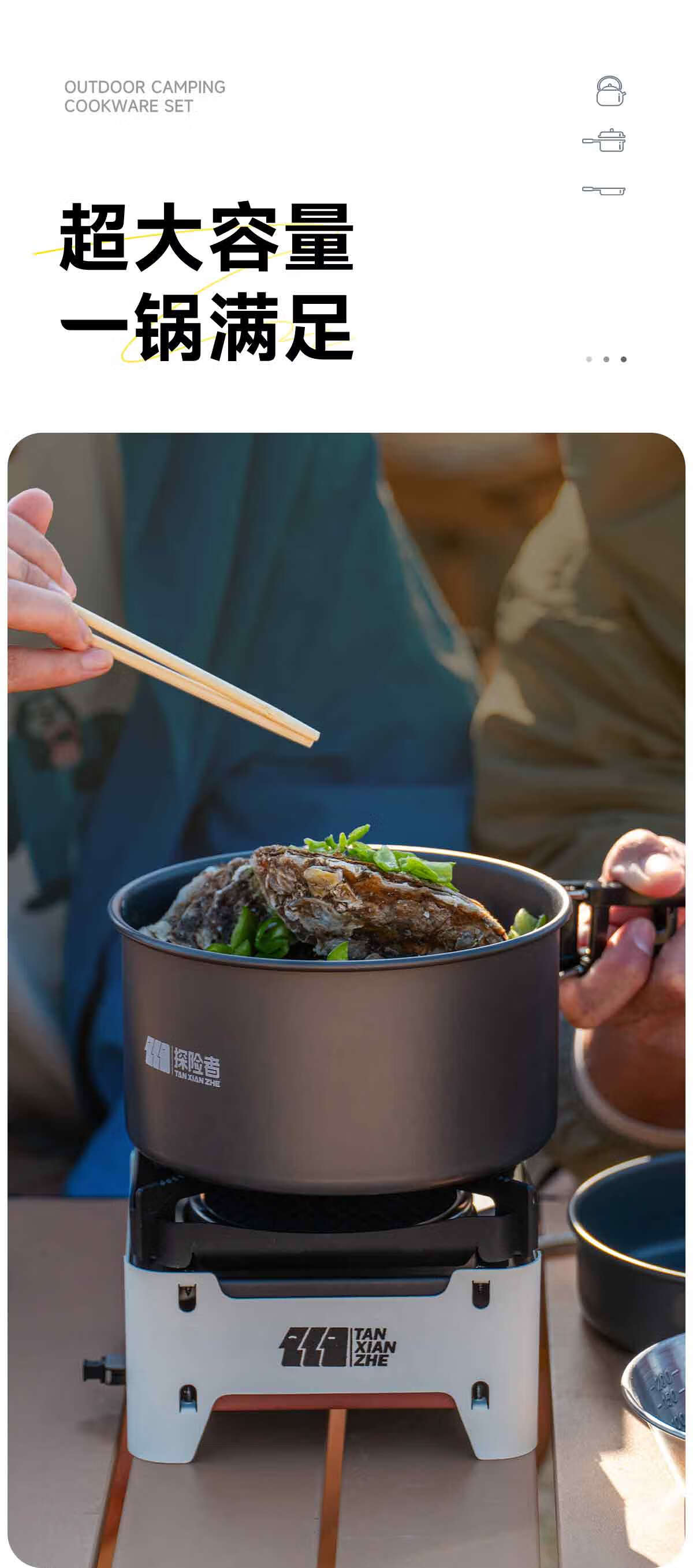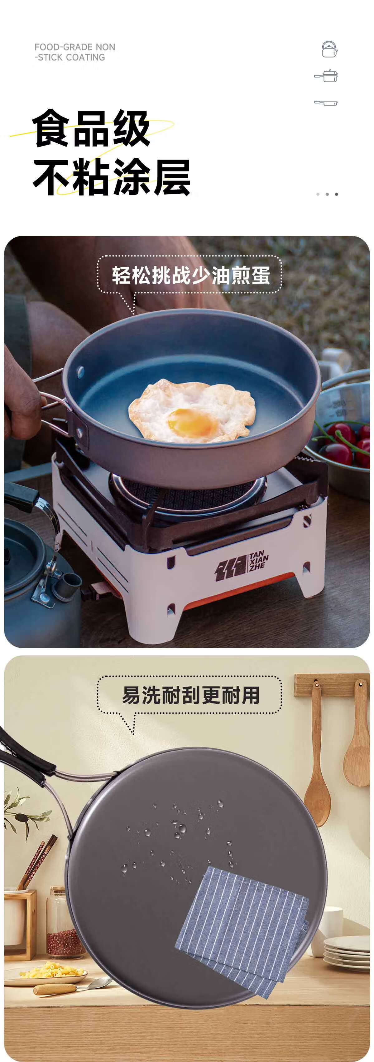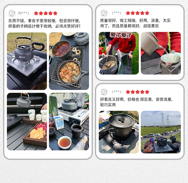这套户外炊具简直是为露营而生的艺术品!深灰哑光质感高级又耐脏,三件套的三角排列设计节省空间又和谐。最爱那个三瓣花旋钮锅盖,煮面时蒸汽孔出气均匀,C型提手防烫超贴心。平底锅煎蛋完全不粘,折叠壶嘴倒水精准不洒漏。粗布背景拍出了荒野厨房的浪漫,实测收纳后只占背包角落。