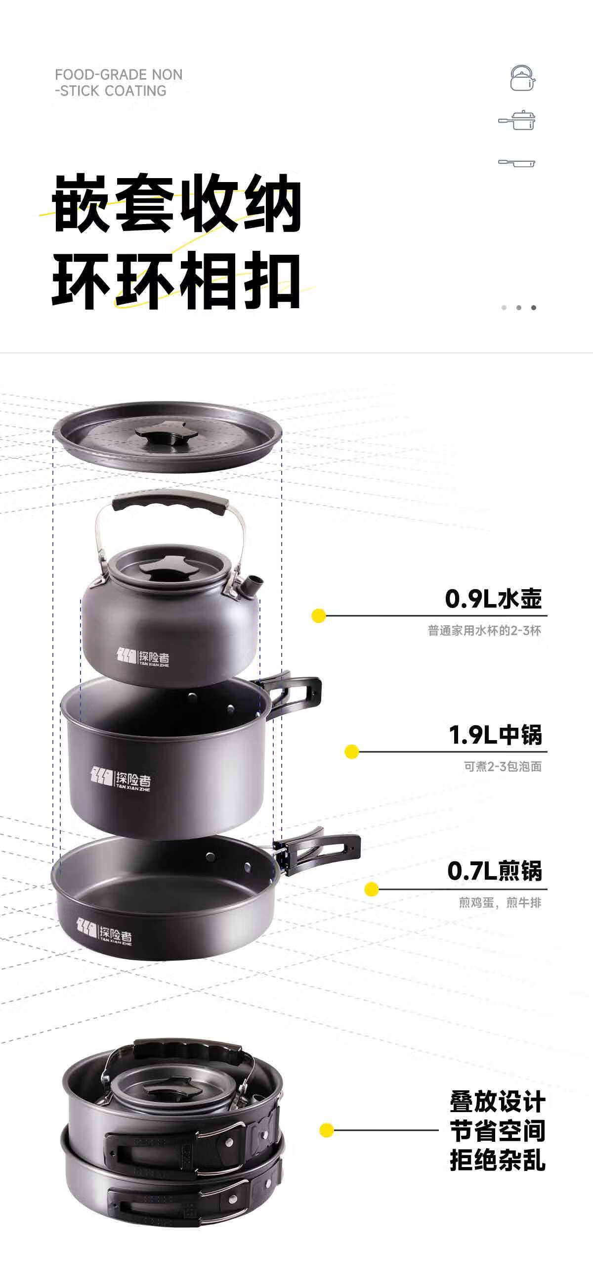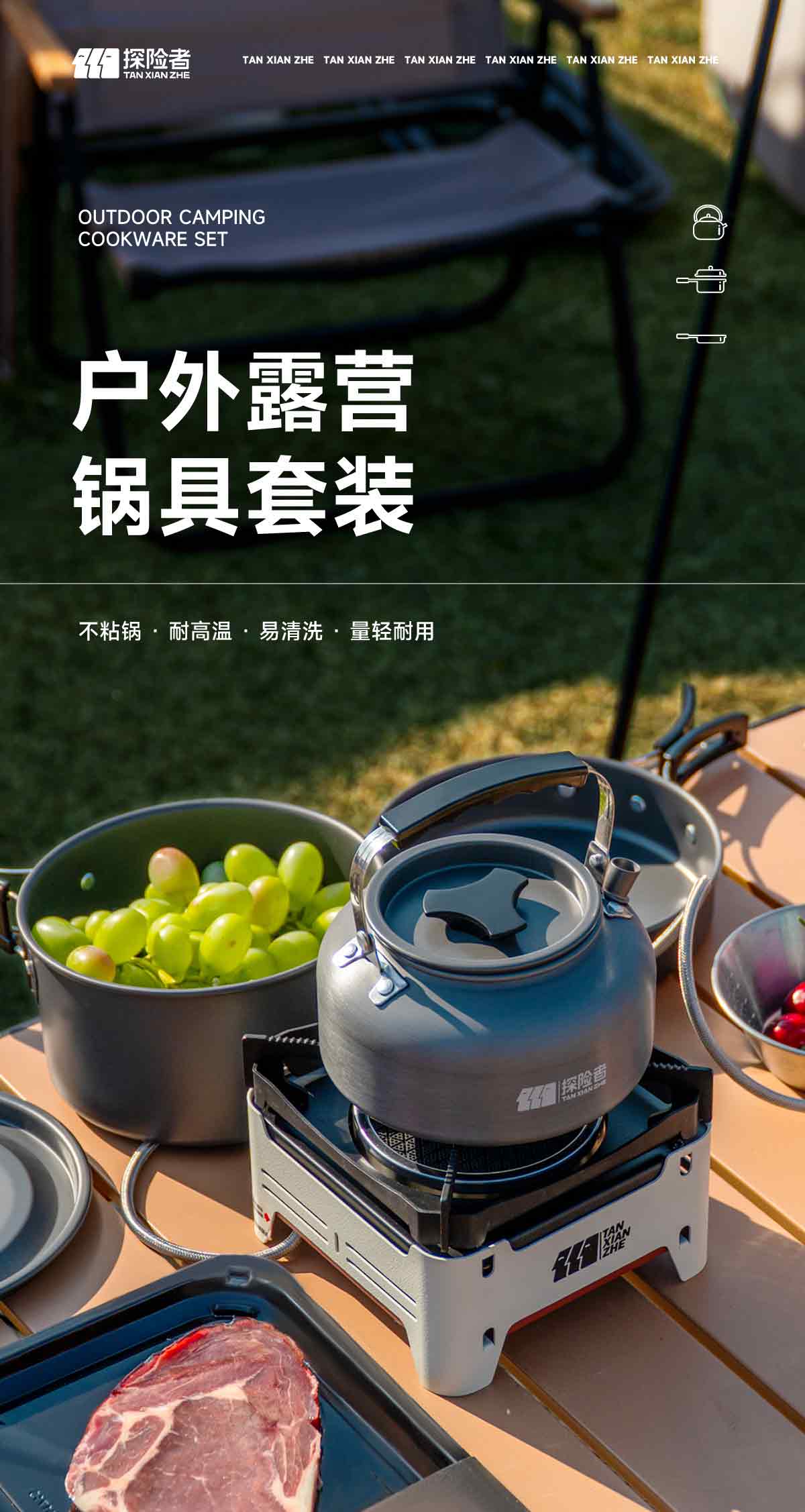 探险者户外锅具套装卡式炉锅具三件套户外烧水壶露营锅具全套装备野餐 锅具三件套+316烤盘烤肉套餐一