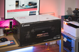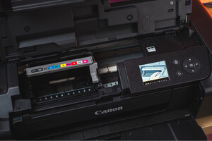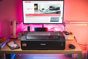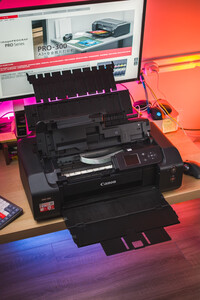 外观升级了,多了显示屏和操作按键。屏幕和按键使得初始化、参数设置变得可视化、更便捷了。初始化速度比过往代Pro-10慢了很多,全程耗费了大约十分钟时间。打印质量没有变化,十分清晰、说利。打印速度比过往代 Pro-10 明显快了很多(300dpi、A4画幅无边框打印、LU-101相 纸)。 附赠配件:说明书、保修单、驱动和软件安装CD(这个………我没有光驱,无法测试)、电源线、USB线(传统的A口)、CD打印托盘(这年代还有多少人能用 CD啊雪)、打印头及墨盒托盘、10色墨盒。 接口:电源、USB、网线。 连接:USB直连、LAN局域网、WLAN无线局域网。 佳能提供的连接方案挺全的。为了保障性,我选择通过网线直连到局域网中。在macOS安装驱动时瞬间就搜到Pro-300打印机了。安装过程还算简单,只是最后一步提示需要安装驱动……没找到……理论上macOS是能够自动匹配驱动的,最后也没有影响我的打印过程和打印质量(通过最新版 Lightroom Classic CC 直接打印)。 需要注意的是,打印机打印时需要放置在稳定的平面上。桌子晃悠的话是不行