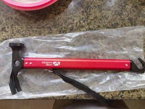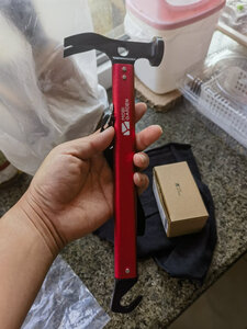 我露营的装备有很多都是牧高笛的,这次国庆露营后总觉得自己的锤子太笨重了想换一把,京东上看到这把牧高笛地钉锤锤头和尾钩的材质是高碳钢,中间把手是铝合金,整体重量375克,拿在手里很轻便,就果断入手了,下次露营就带这个了。