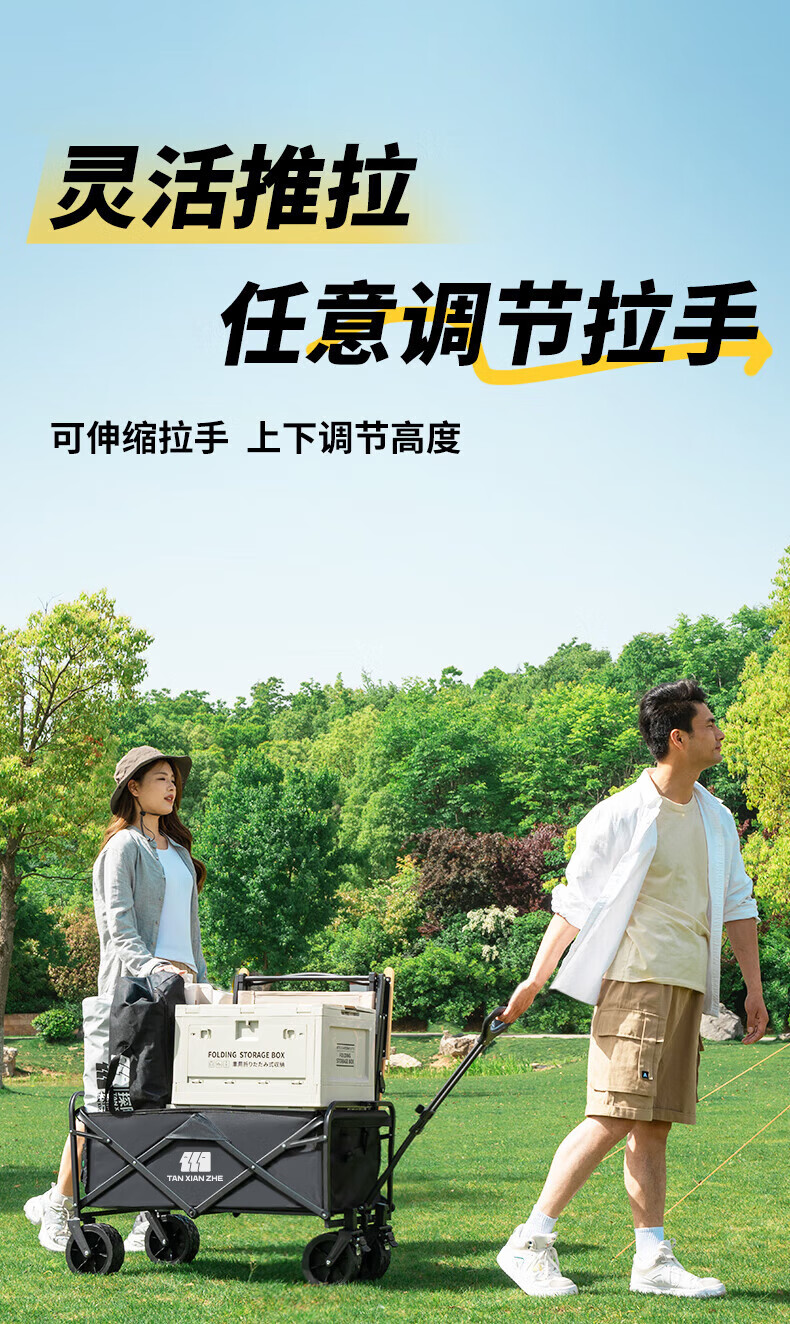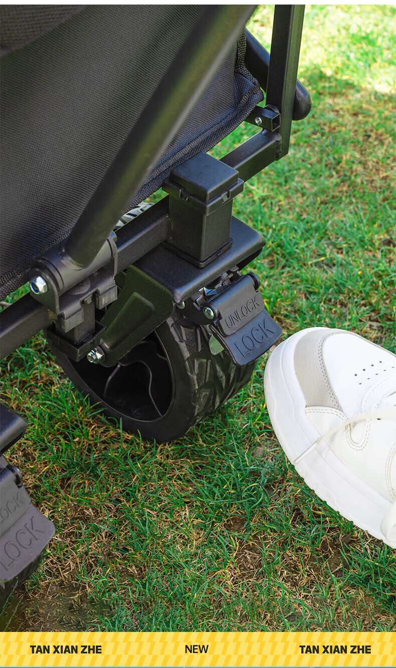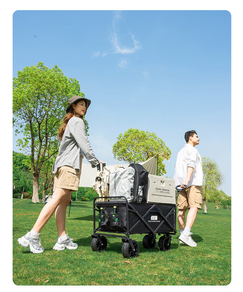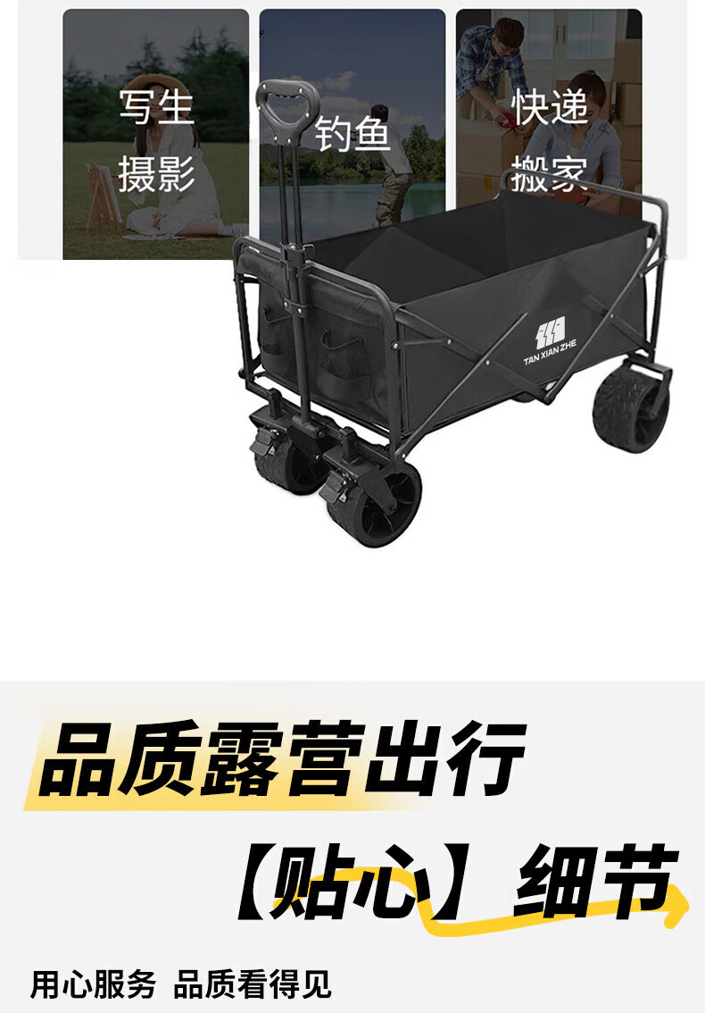 探险者(TAN XIAN ZHE)聚拢型小推车加厚四轮越野钓鱼户外便携野餐车拉小孩多功能 黑色【聚拢型小巧收纳】 加大款轻便轮