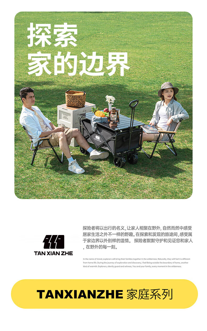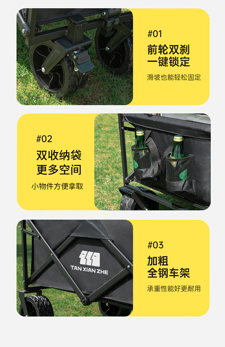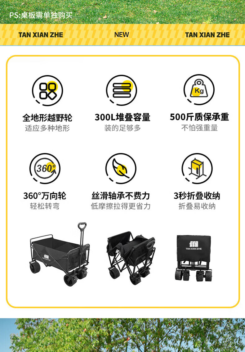 探险者(TAN XIAN ZHE)聚拢型小推车加厚四轮越野钓鱼户外便携野餐车拉小孩多功能 黑色【聚拢型小巧收纳】 加大款轻便轮
