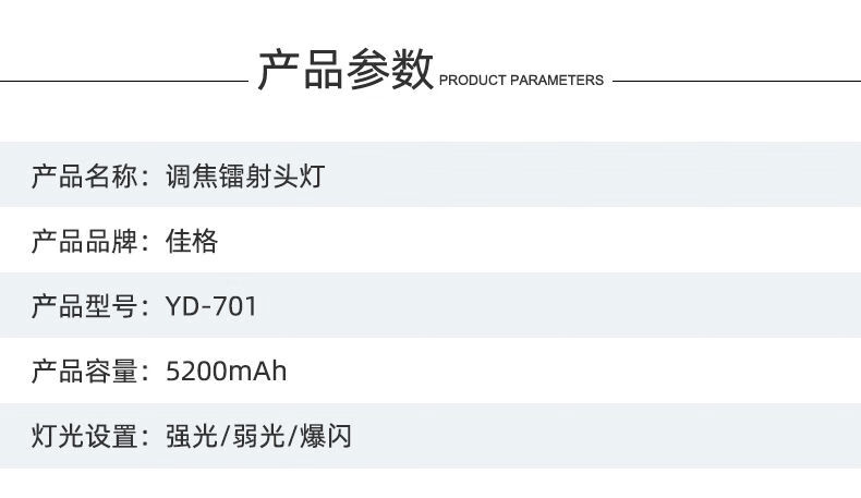 佳格701可变焦E强光照明头灯亮可充电头戴式特亮手电筒便携式 701E戴式特亮手电筒便携式