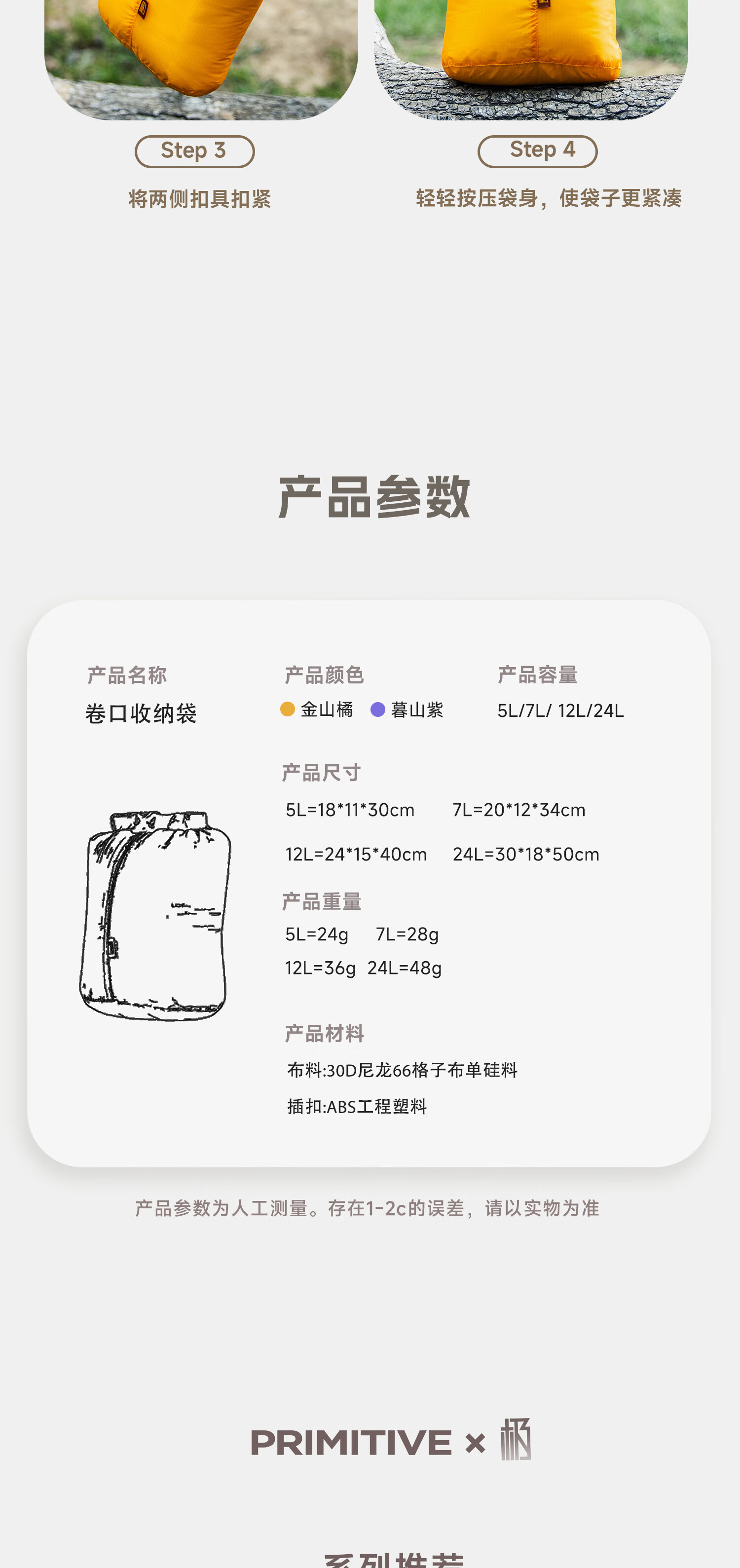 原始人(The Primitive)户外防水卷口收纳袋户外徒步轻量化真空压缩分装袋多规格便携束口 金山橘【4只装】抗污拒水