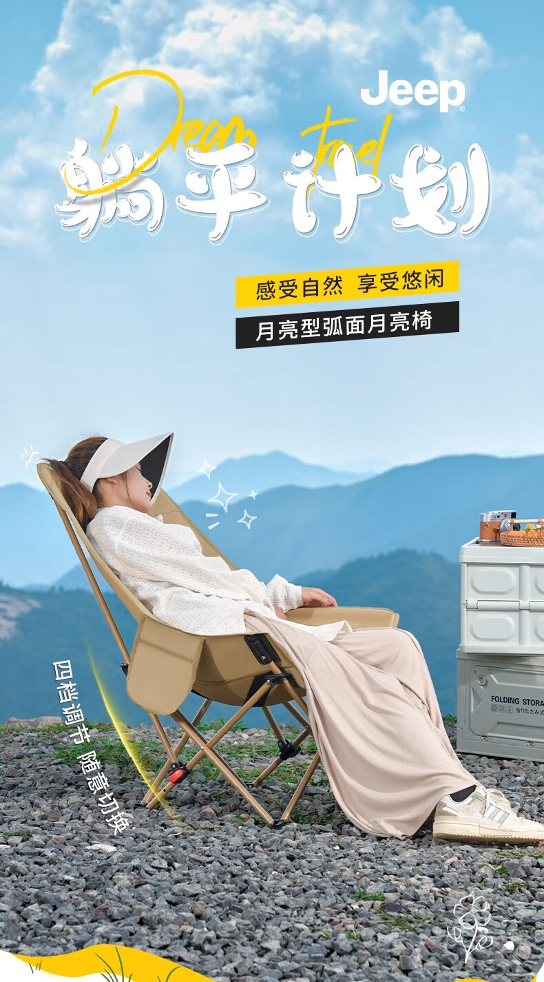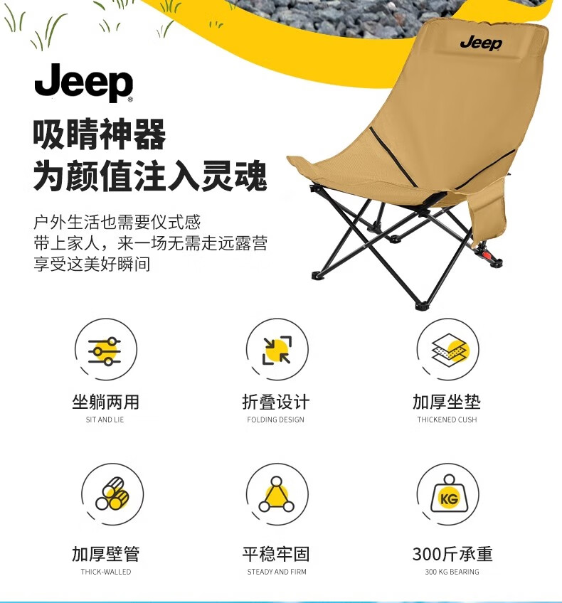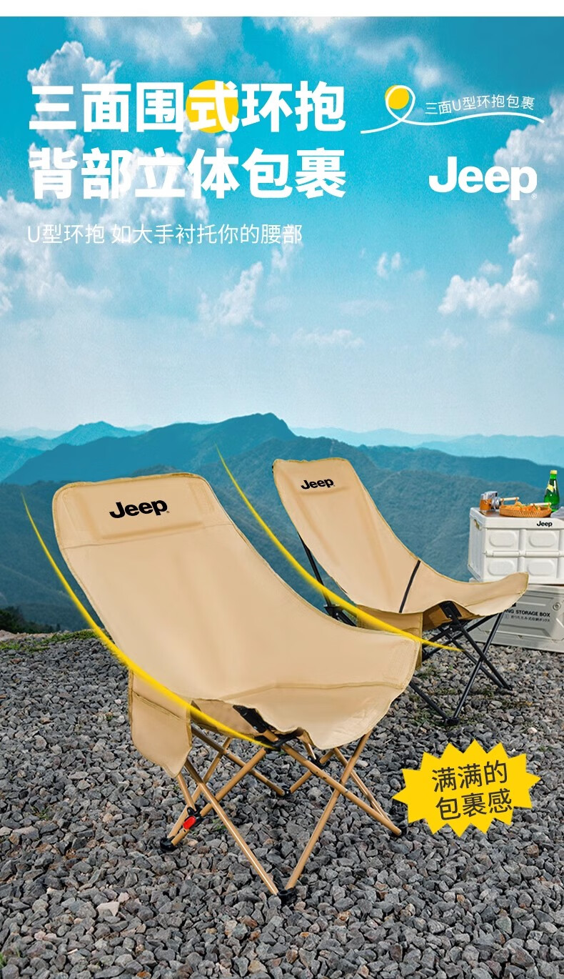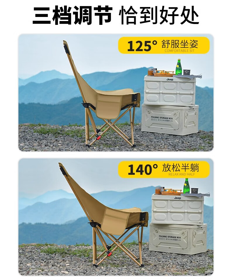 JEEP户外装备便携折叠椅露营沙滩躺椅钓鱼椅高靠背凳月亮椅午休椅坐椅 【曜石黑】三挡调节【可倚坐躺】-承重300斤