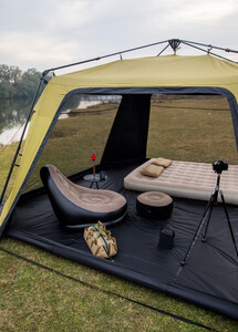 非常豪华的野外客厅,家人都很喜欢!第一次使用,搭建一点不费力!今天风有点大,拉了两根风绳,搭了三片门帘,既能挡风,也不影响观景,纱窗很实用!