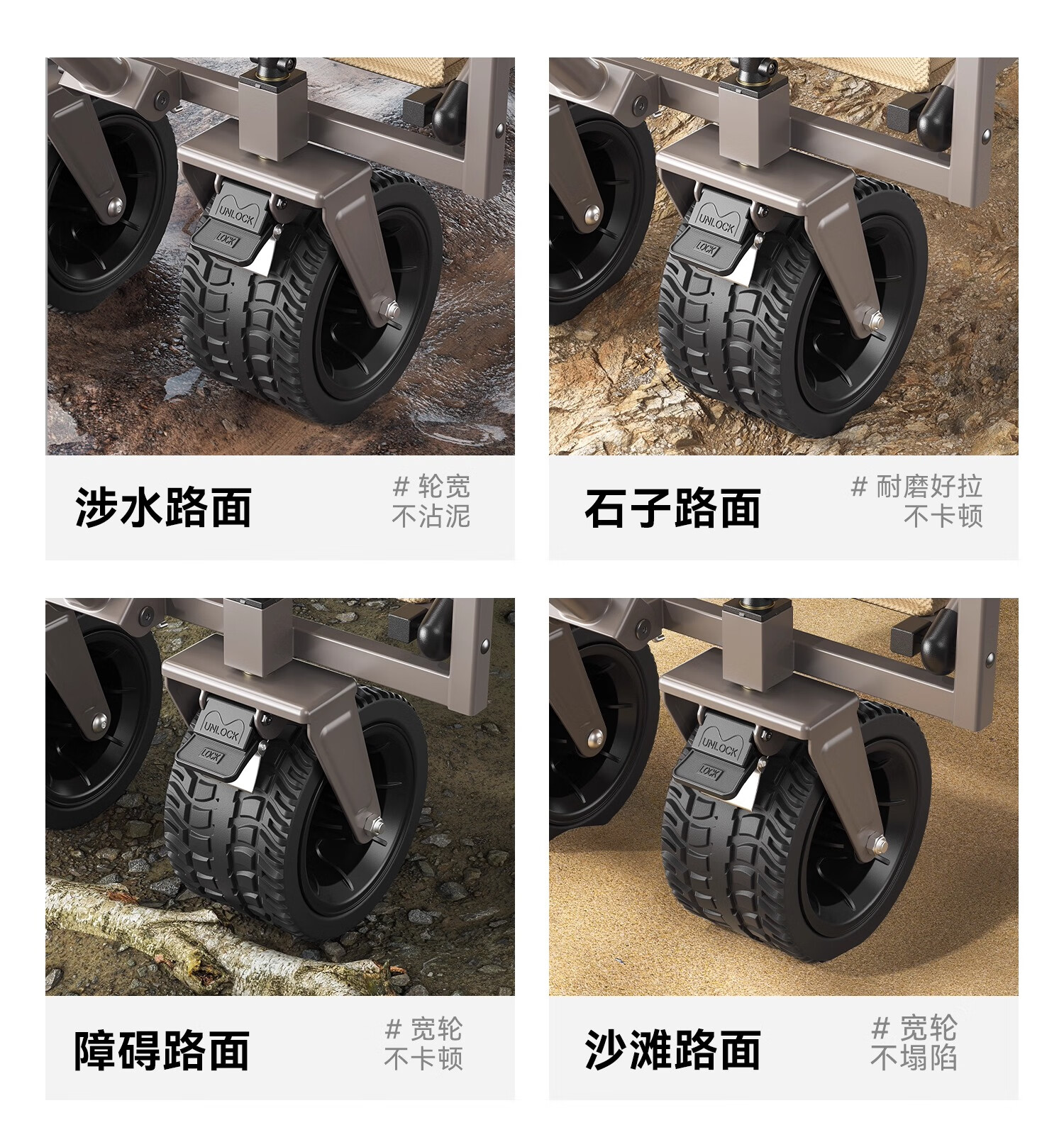 露营车能显著提升户外露营的便利性与舒适度: • 减少体力消耗:搬运20kg装备时,露营车比手提能减少65%的体力消耗(尤其适合女性或老人); • 提供安全保障:部分车型带有刹车系统(如前轮双刹车),斜坡驻车时能稳如泰山,避免装备滑落; • 增加亲子友好功能:前置杯架、隐藏式储物袋等设计,方便妈妈们放置孩子的玩具或水杯,成为“亲子露营的刚需”