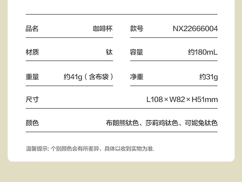 做工精细,容量大小刚好,可以喝咖啡,也可以品酒。钛比较轻,适合出差或户外旅行随身携带。挂钩把手方便携带,也可挂起来放置的