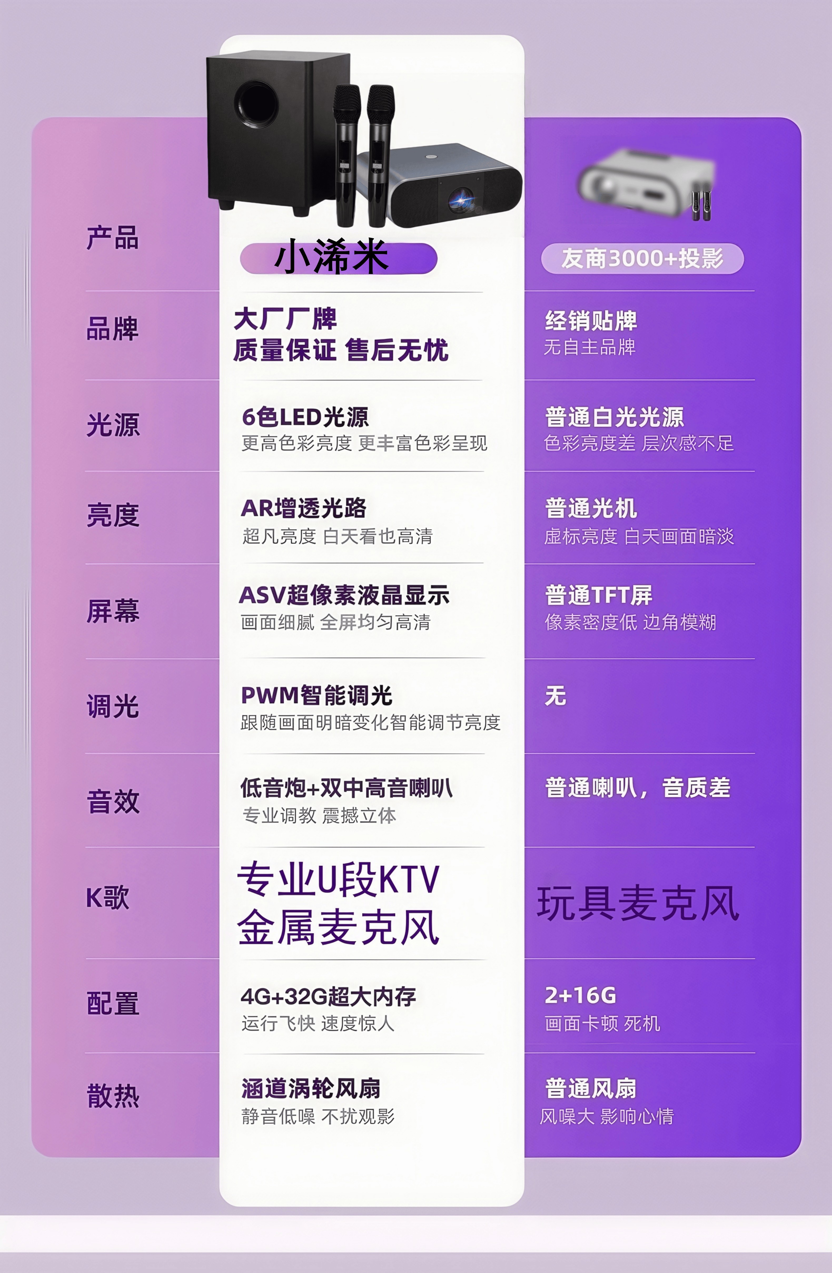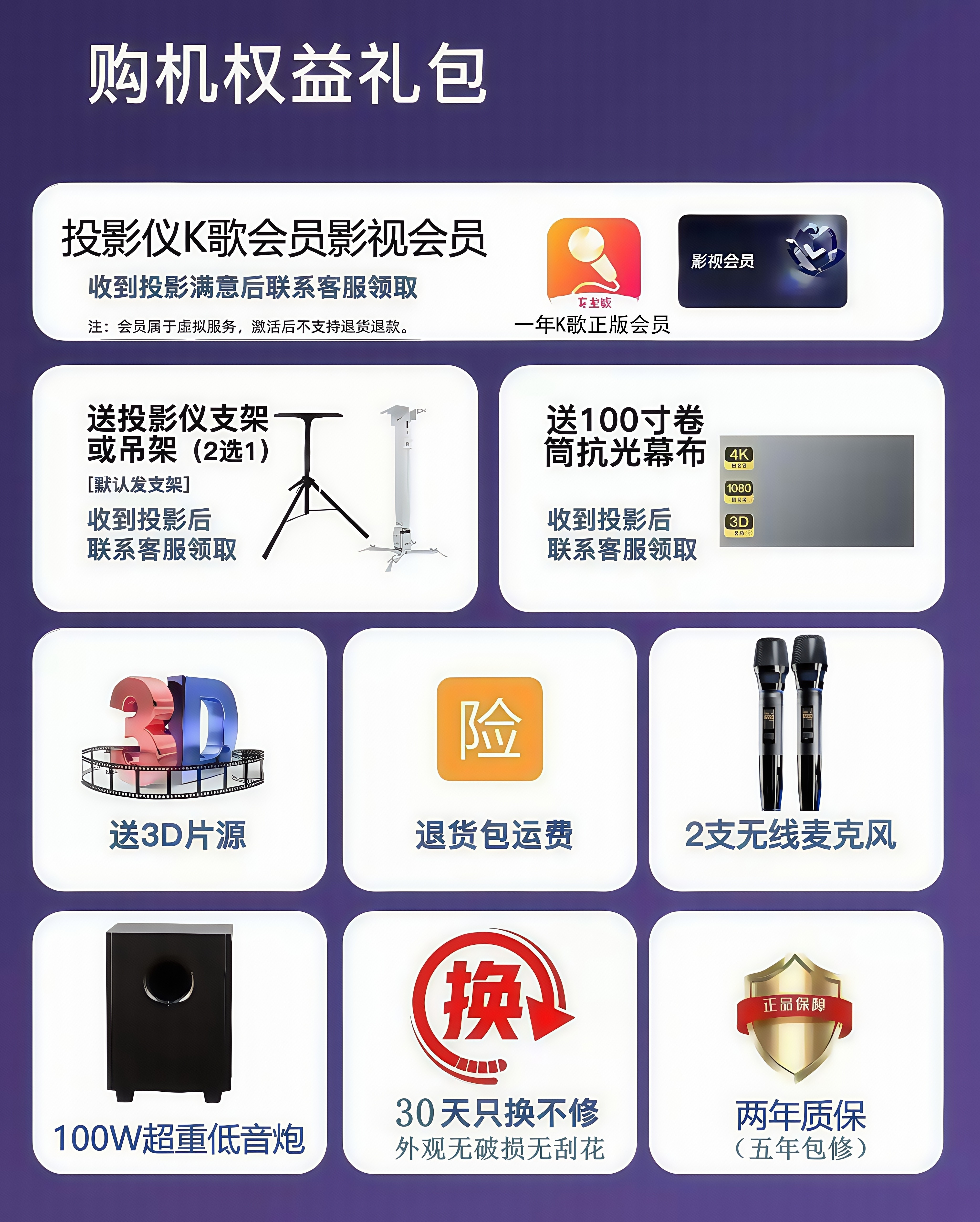 投影仪*1 低音炮*1 麦克风*2 电池*6 电源线*2 遥控器*1 说明书*1 三包合格证*1
