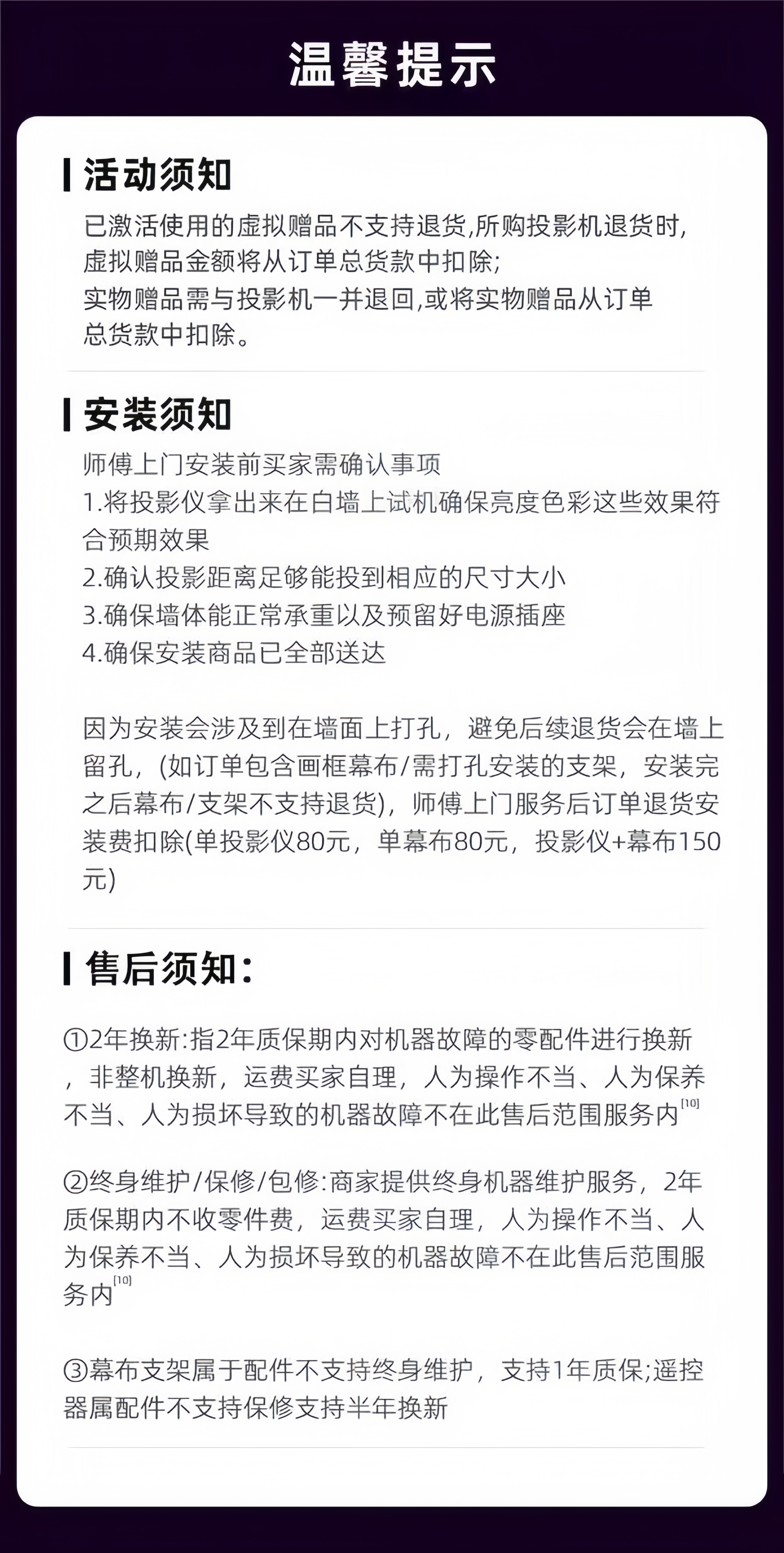 投影仪收到了,我的是吊装安装的直接投屏到电视墙,画质清晰 ,开机不卡顿,音质清晰 话筒 音响很给力,售后服务小姐姐特别好!很到位!