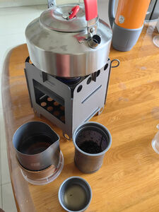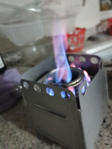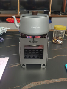 东西很小巧,携带方便,出外烧个水还行。酒精炉加入酒精后炉子的火烧得很旺,小柴火炉也很好用,拆了也方便存放,放上酒精炉很好用。