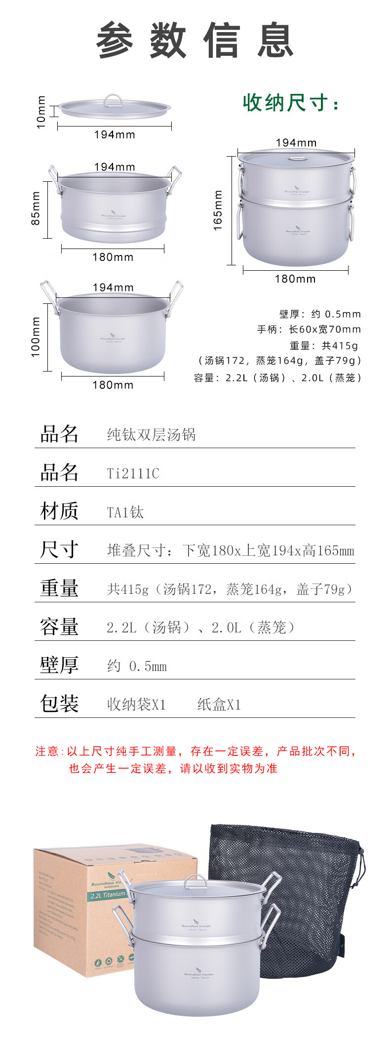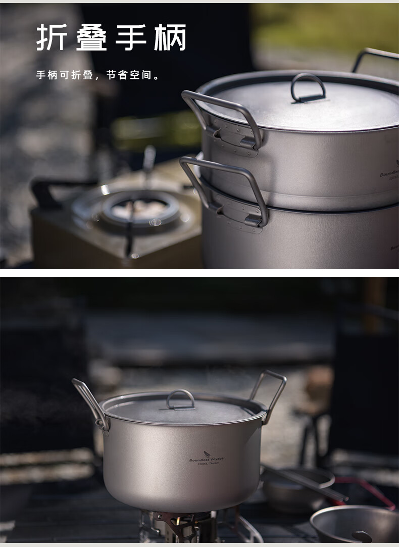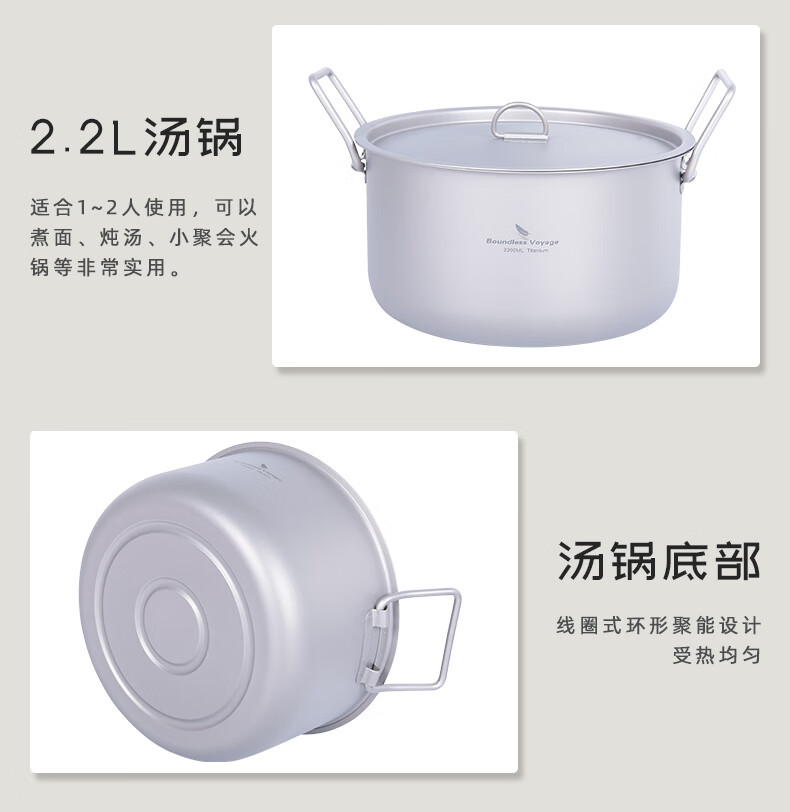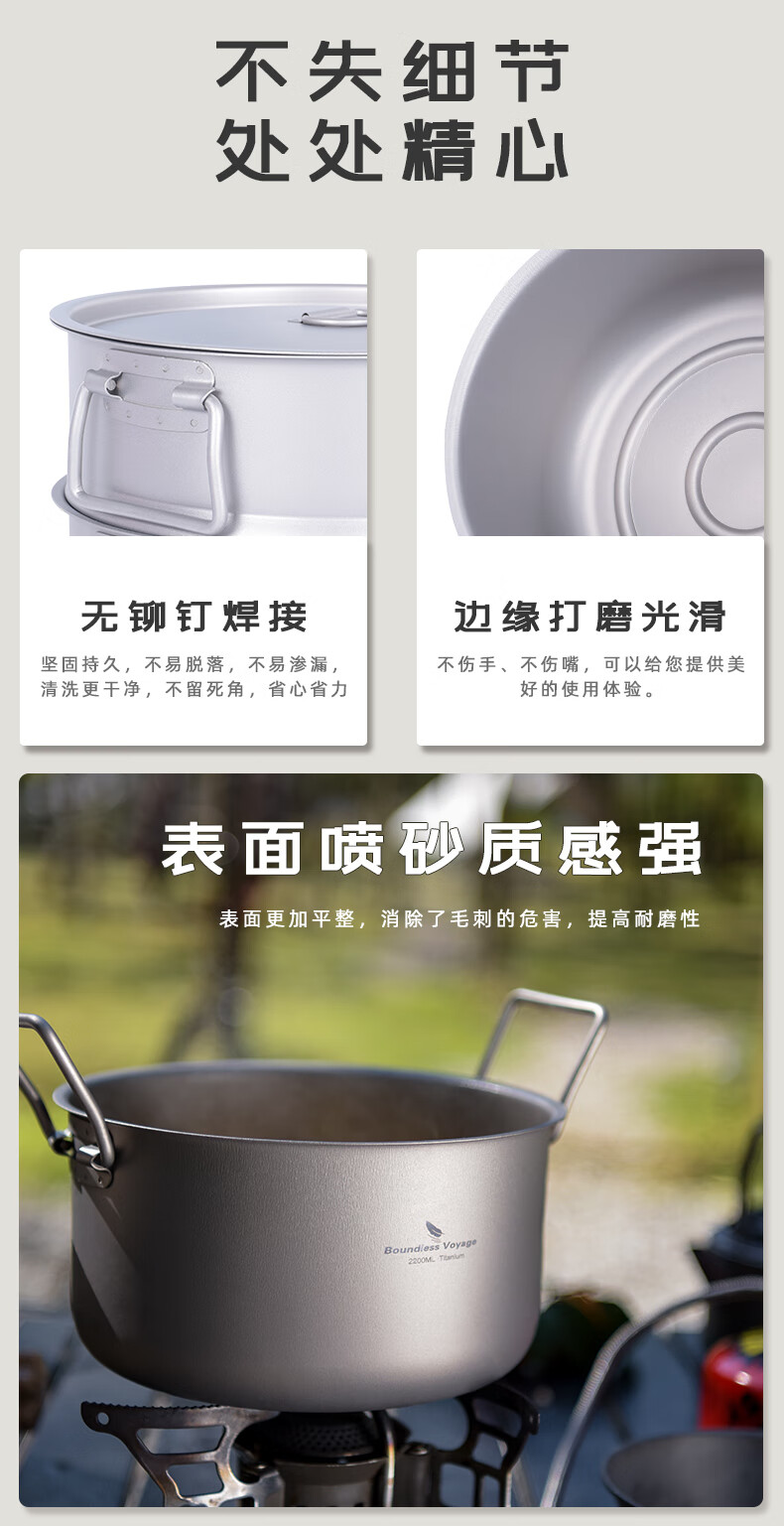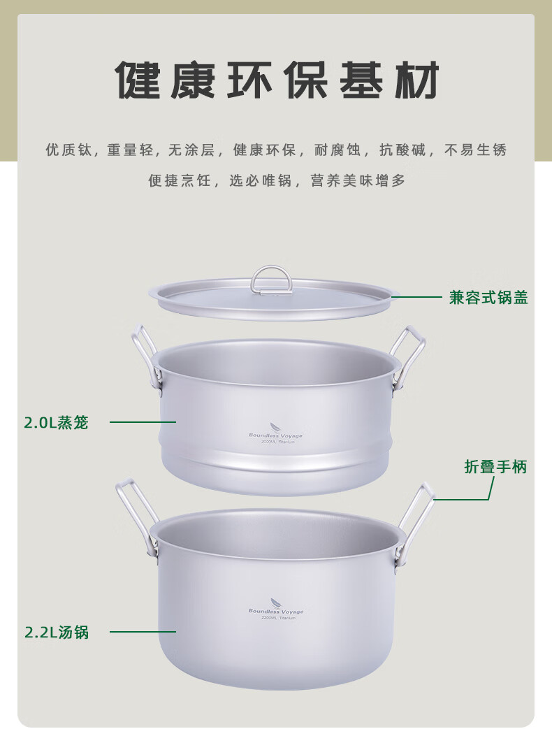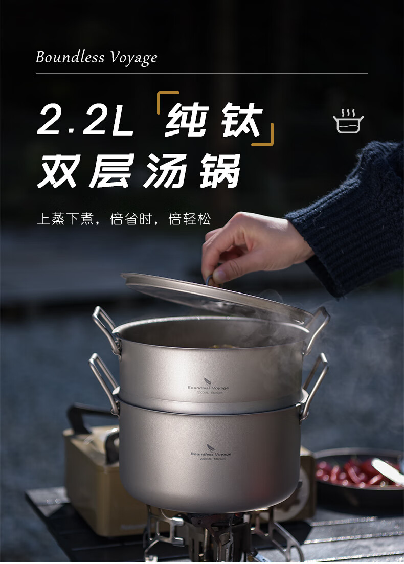 必唯(BOUNDLESS VOYAGE)必唯纯钛户外蒸锅2.2L汤锅轻量便携露营火锅野炊钛锅野营锅具炊具 Ti2111C 2.2L汤锅+2L蒸隔