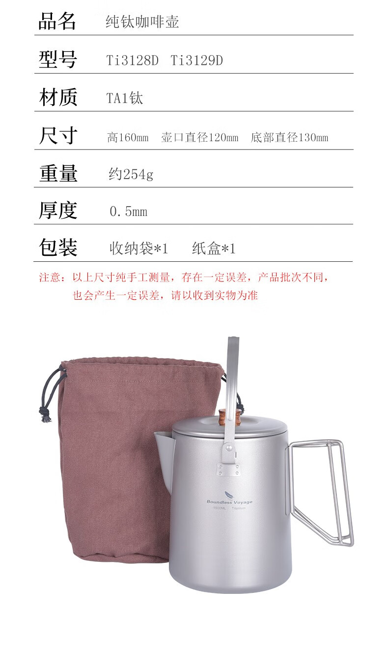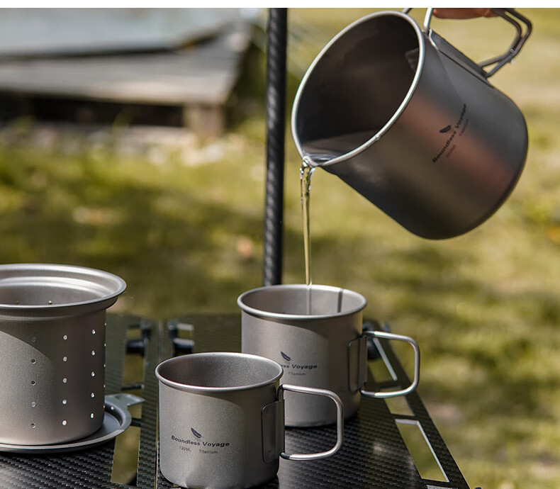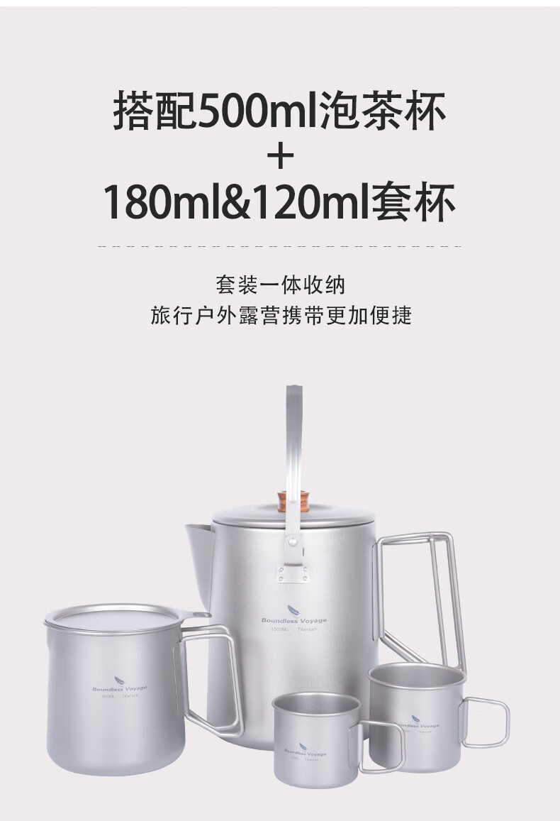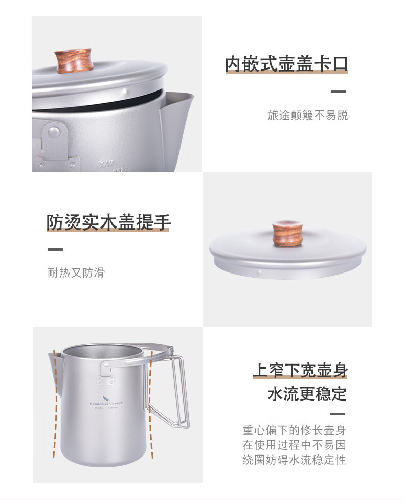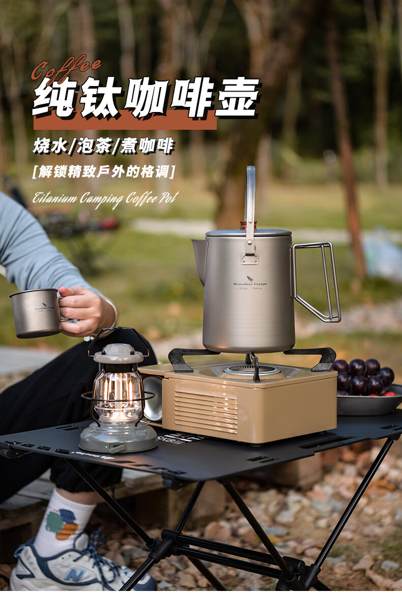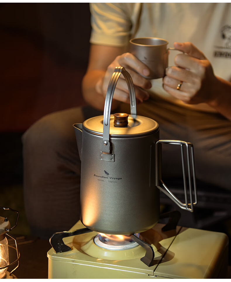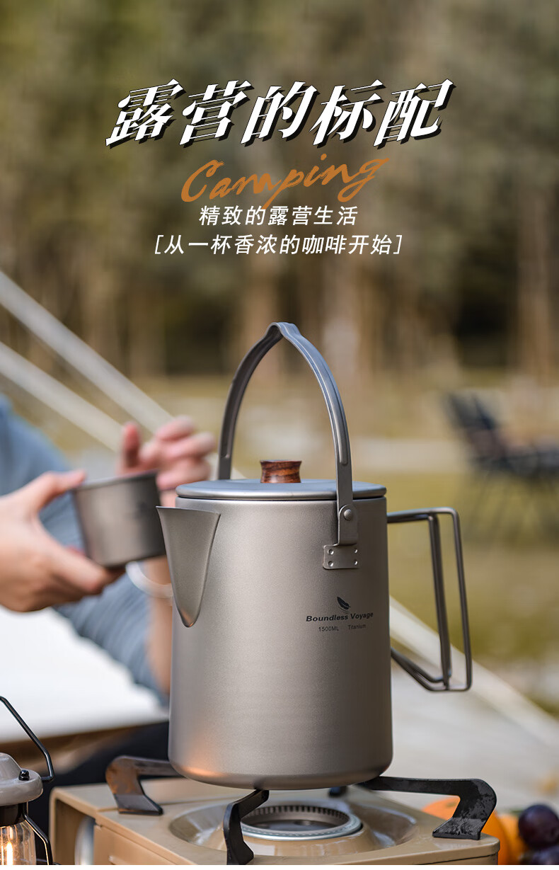 必唯(BOUNDLESS VOYAGE)纯钛户外咖啡壶1500ml折叠手柄便携露营咖啡杯野营烧水壶单层 Ti3128D 1.5L咖啡壶