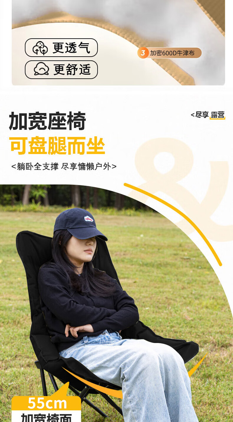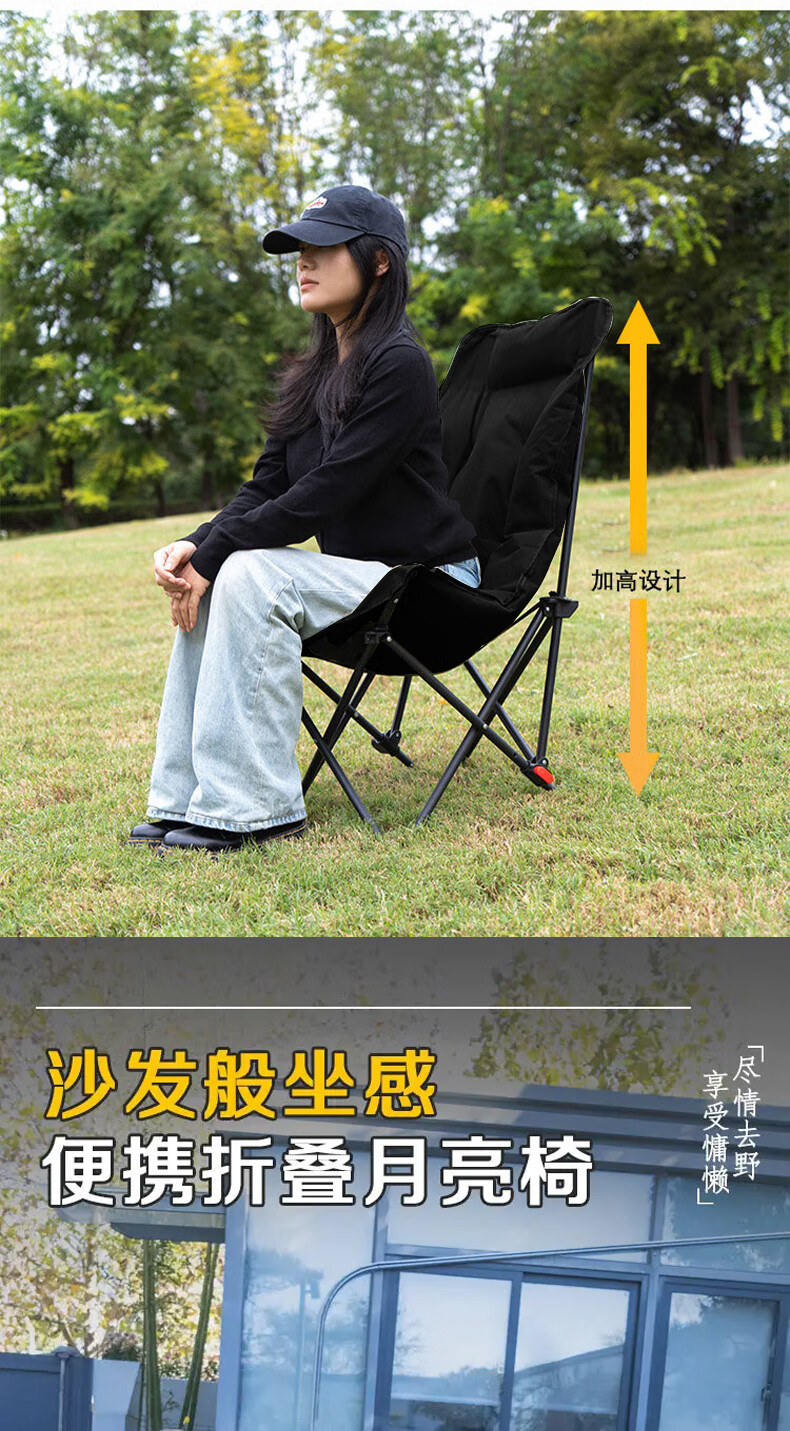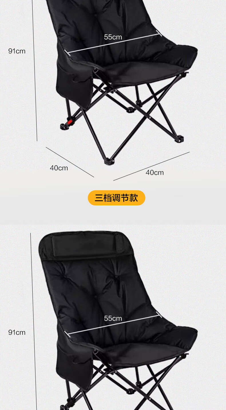北岳户外折叠椅午休加高月亮露营椅便携钓鱼凳沙滩午睡躺椅野餐陪护椅 曜石黑-三挡可调节高背舒适