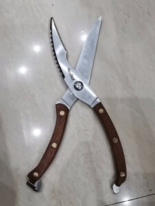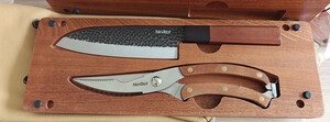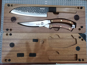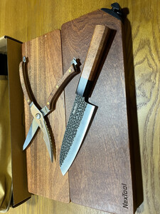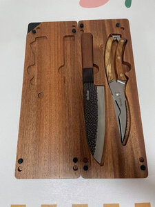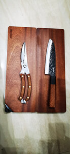 做工不错,磁吸功能很喜欢,收到发现两块版会有色差,问了客服说是纯实木的,由于两块板工艺步骤不一样,需要分开生产,会有些许色差,认真看了下的确是实木的,使用的时候还能区分下生熟区域,刀有点帅,锋利度很好,剪刀还没使用,但是分量挺足,总体都挺满意的,好评