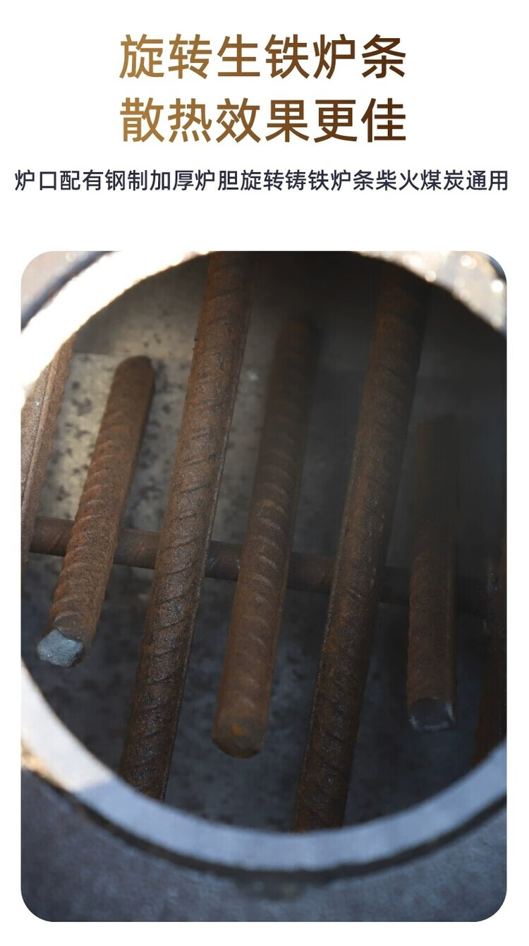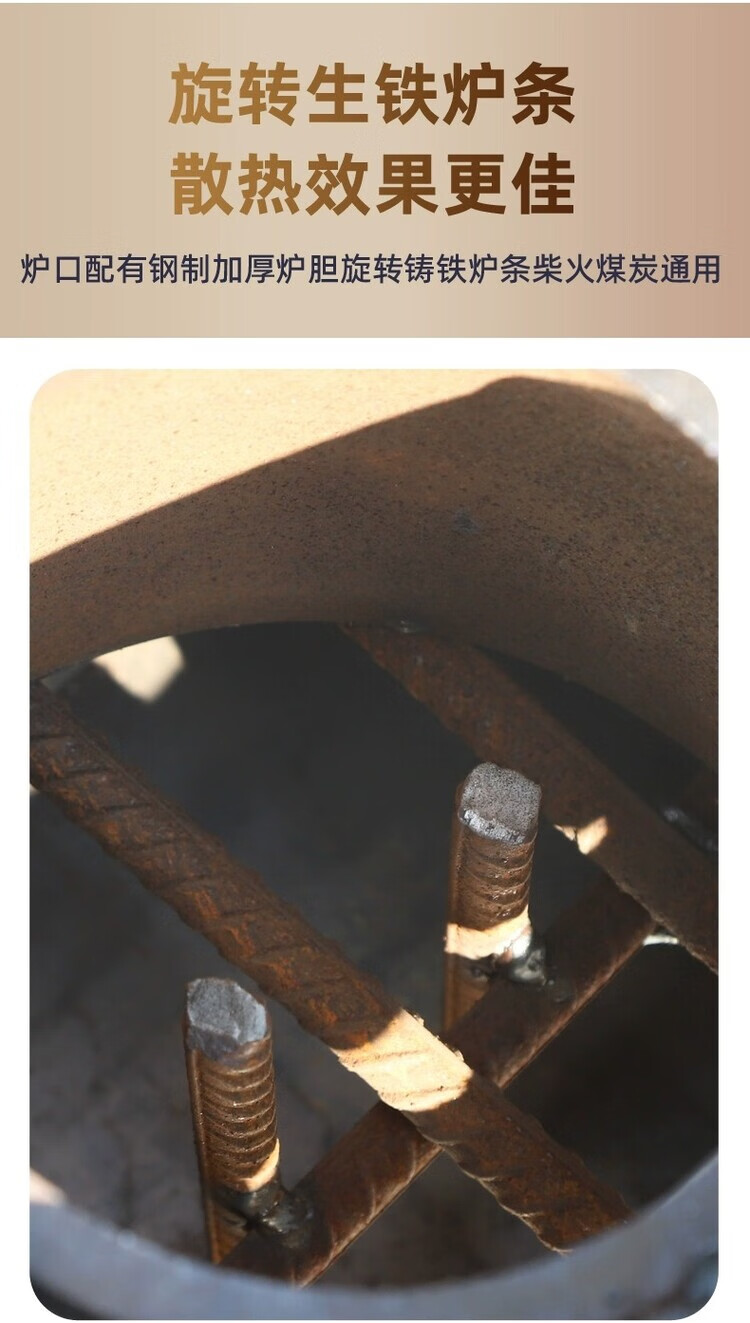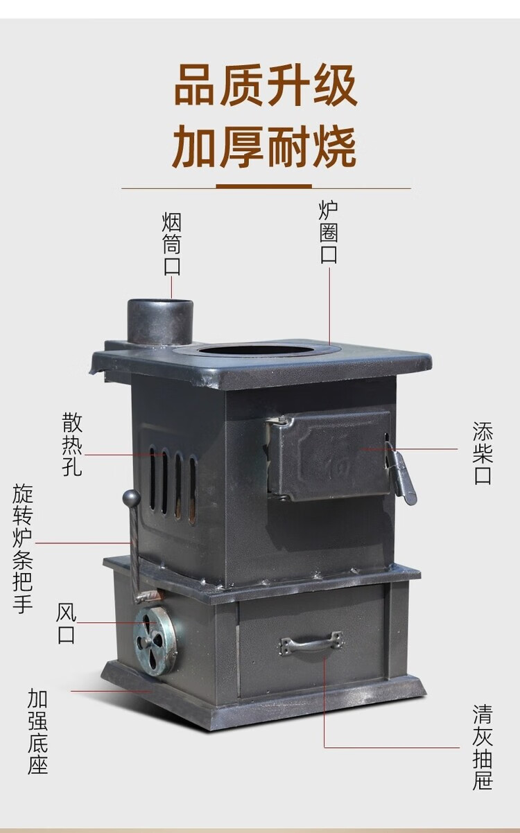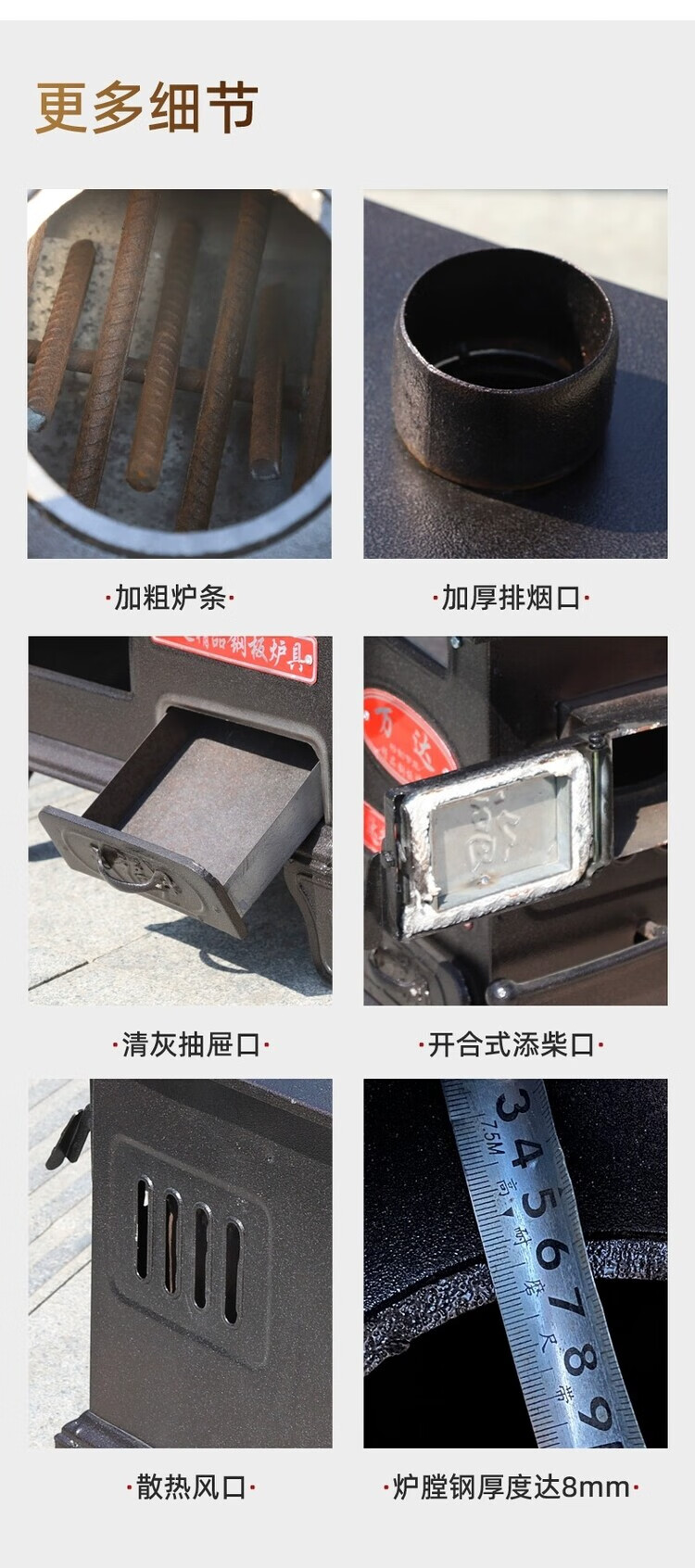炉子整体的材质非常厚实 主要是炉膛的厚度。足足有1cm 非常的厚实 而且这款炉子烧柴,烧煤都可以。可以用很多种燃料。