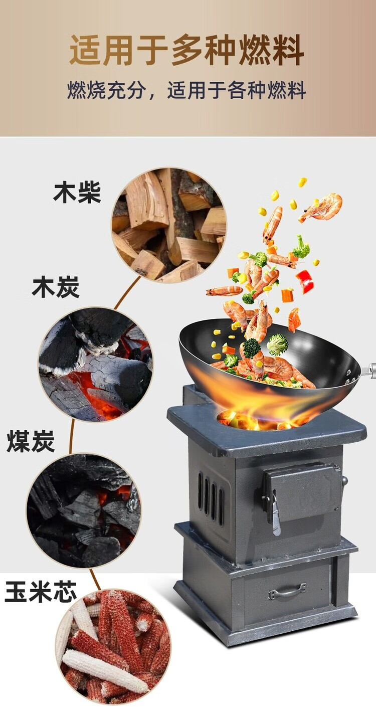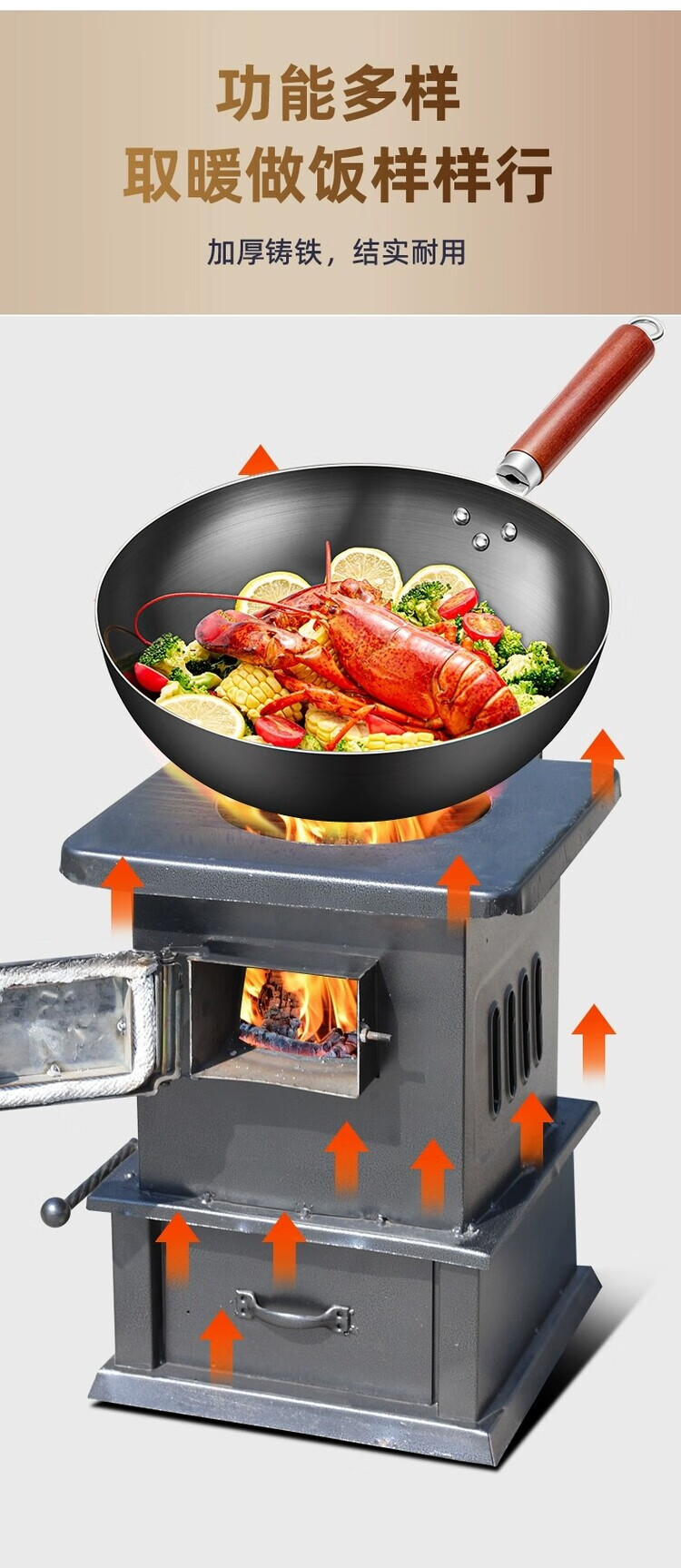 农村柴火炉 家用冬季木煤气取暖炉烧木柴气化炉多功能柴火灶烤火炉 烧柴-配不锈钢烟囱