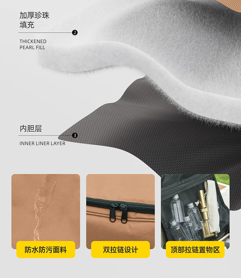 做工很好,非常能装,我把卡式炉,烤盘,2瓶气罐,筷子刀叉都放进去了,收纳功能不错!!!如果袋子外面家一点网兜设计会更完美。