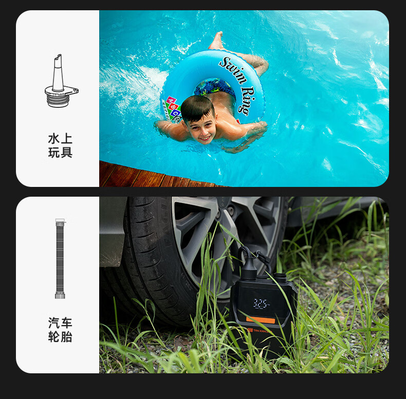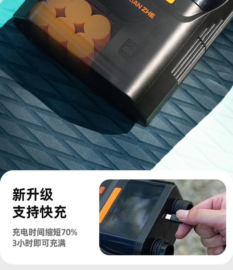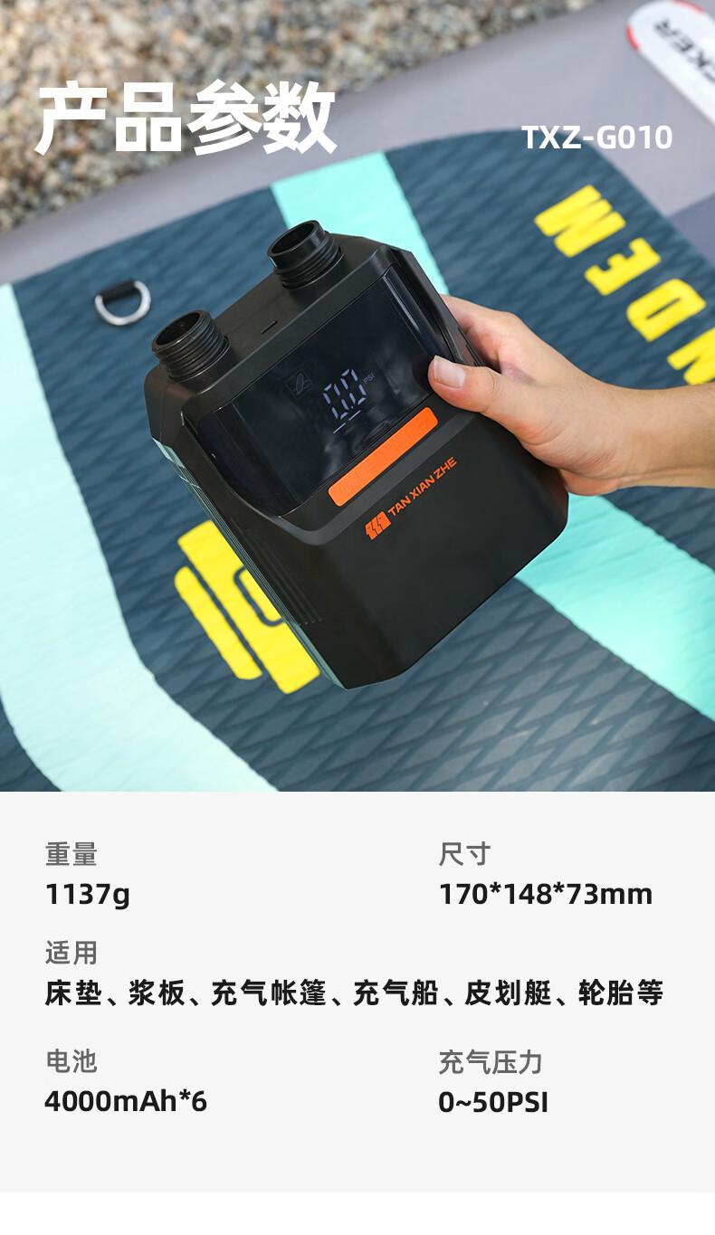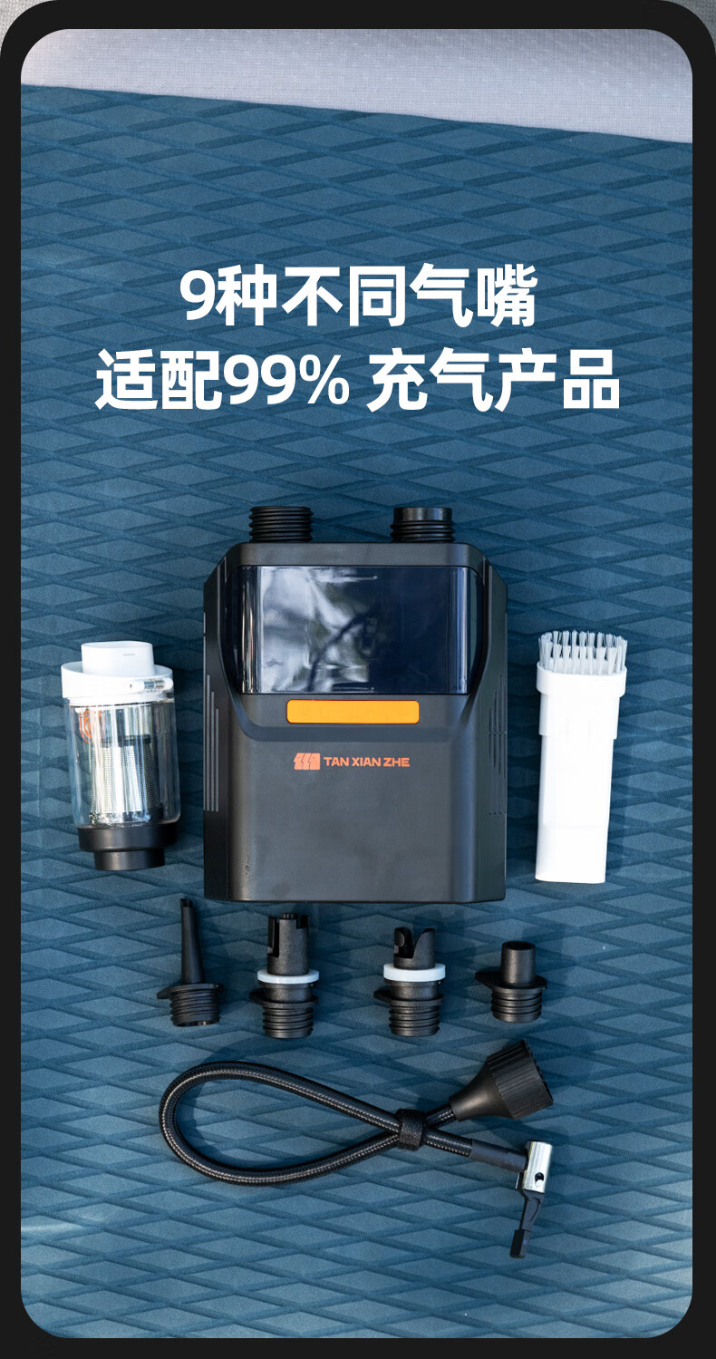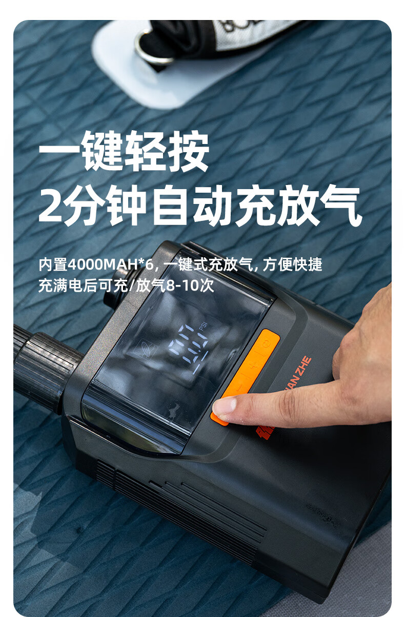 货已收到几天了,直接当场就用了,速度很快,转接头也很多 很小巧还带收纳包,面板能设定气压,我是直接充满按暂停的,也挺方便的,终于可以解放双手了,去年下河玩浆板,手动打气都要好久,打的都影响心情,有了这个充气泵,下河轻轻松松搞定