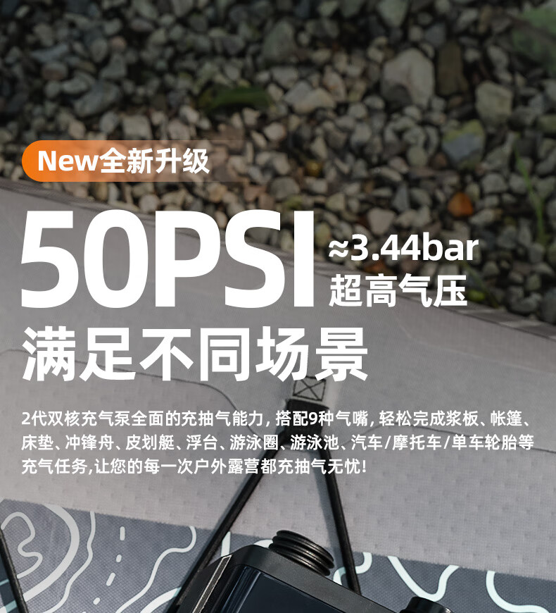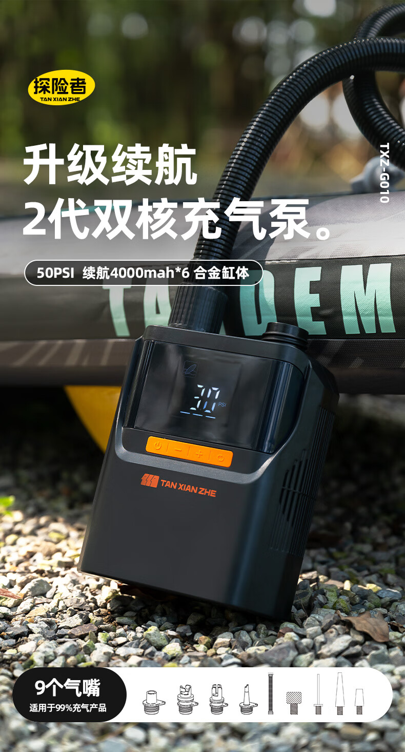 探险者高压电动打气泵桨板SUP露营冲浪板皮划艇冲锋舟橡皮艇充气床轮胎 二代升级款【50psi】双核充气泵