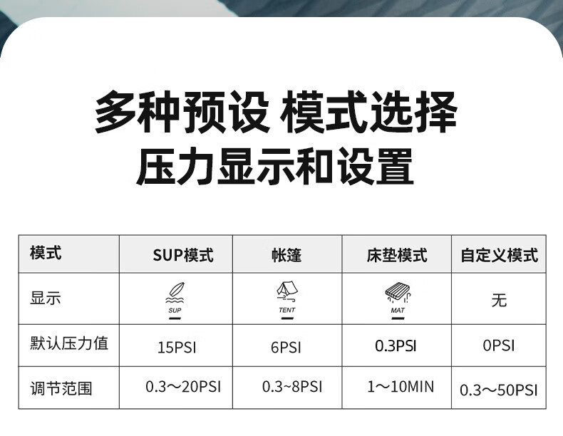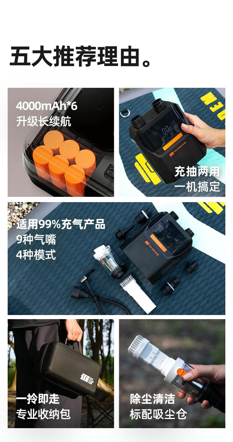 充气长按就开了,速度挺快的,多功能连接头,各种帐篷气垫浆板都能充,还带轮胎的气阀接口,直接全给了,啥都不用操心,充电口是C口的操作很方便,然后选择模式和调整气压就行,持续时间大概半个多小时,已经很顶了。