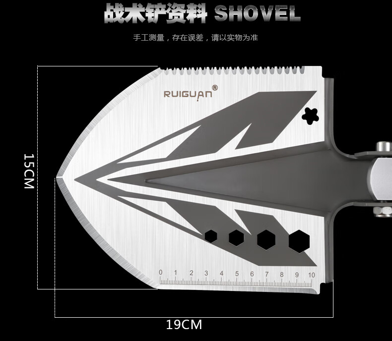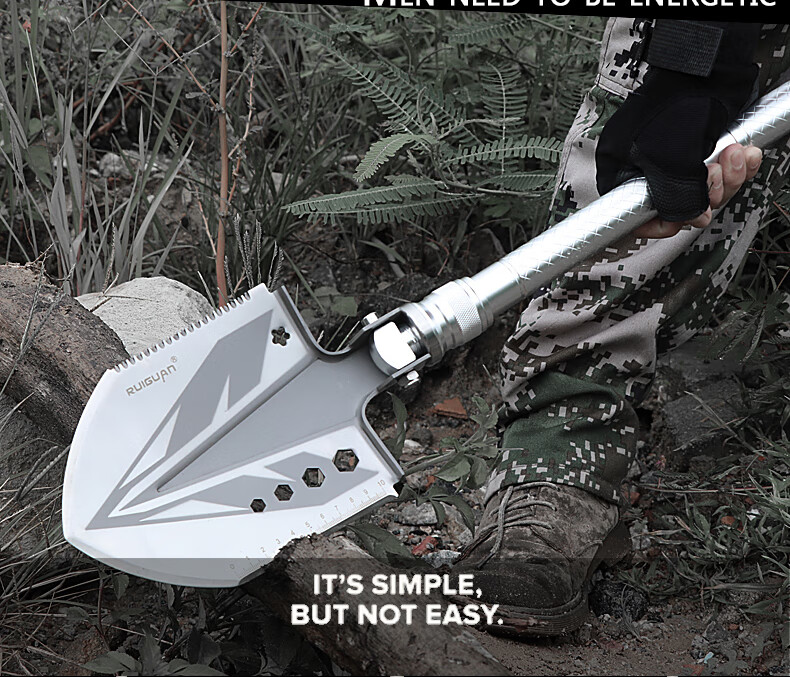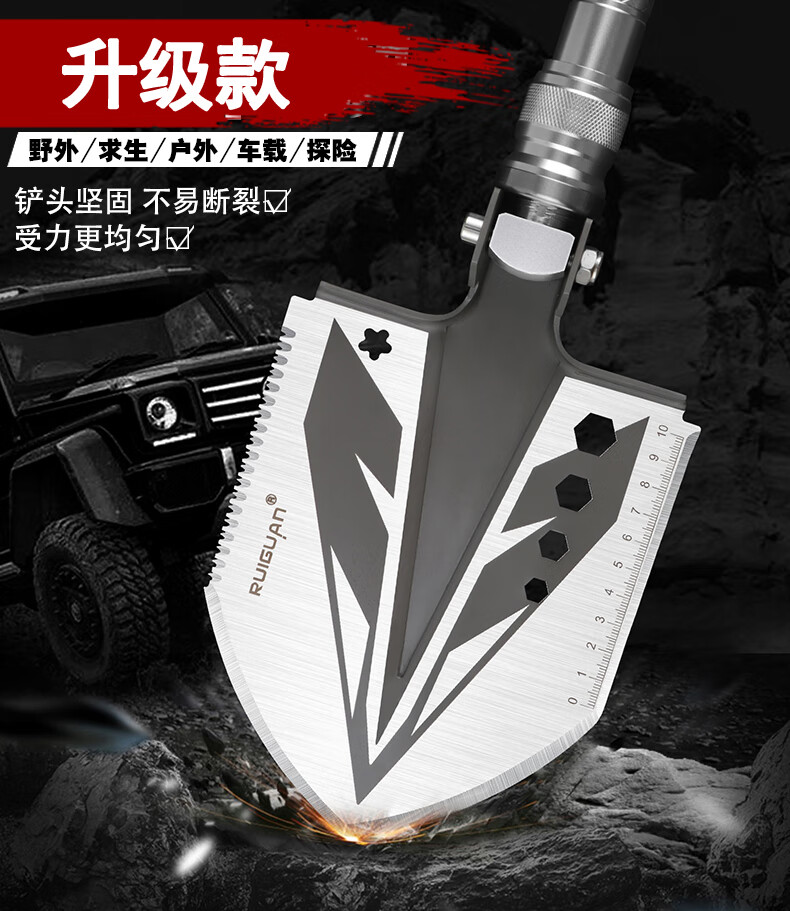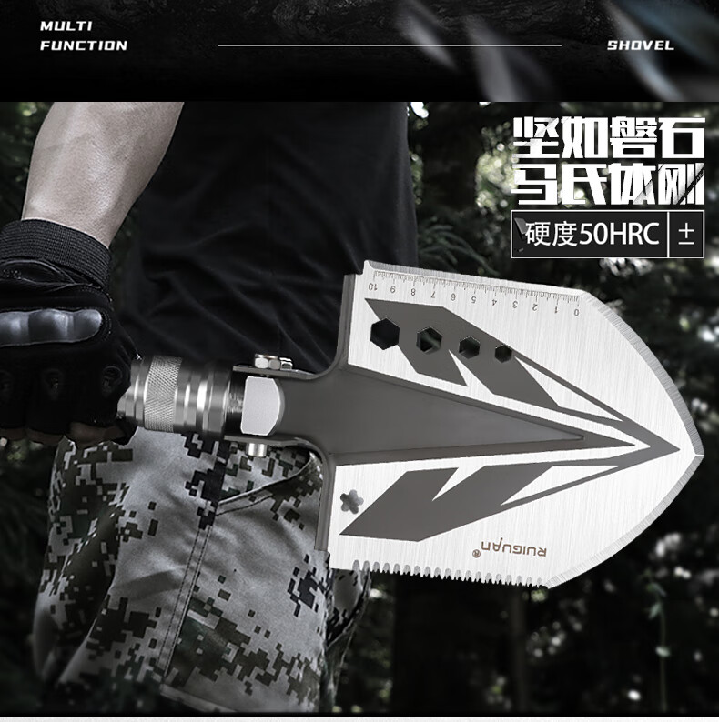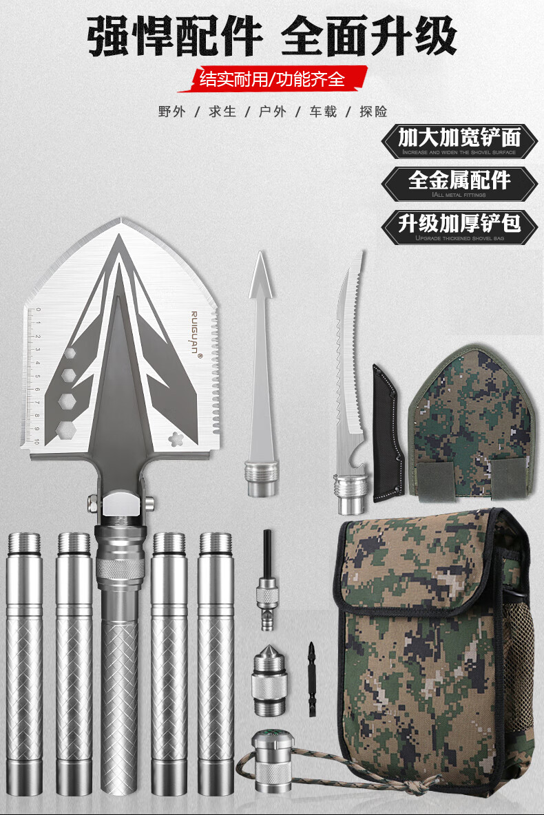 RUIGUAN工兵铲多功能大号兵工铲户外铁锹折叠铲锰钢车载铲挖土钓鱼铲子 银色铲至尊版五节管+包