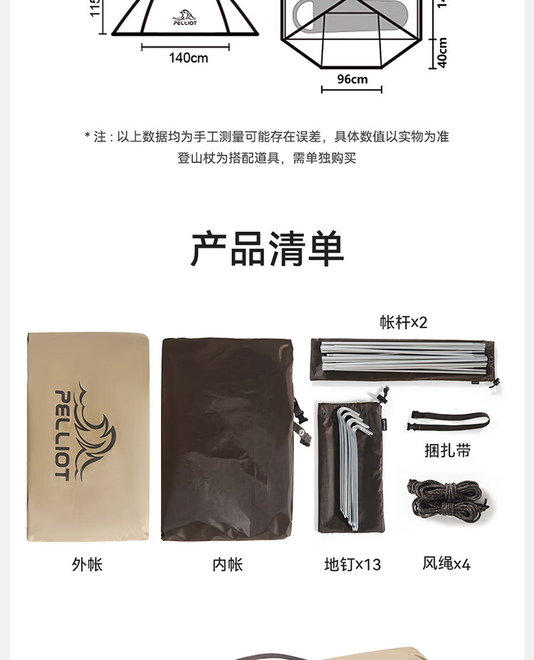 外账*1,内账*1,帐杆*2,地钉*13,风绳*4,捆扎带*1,收纳袋*1