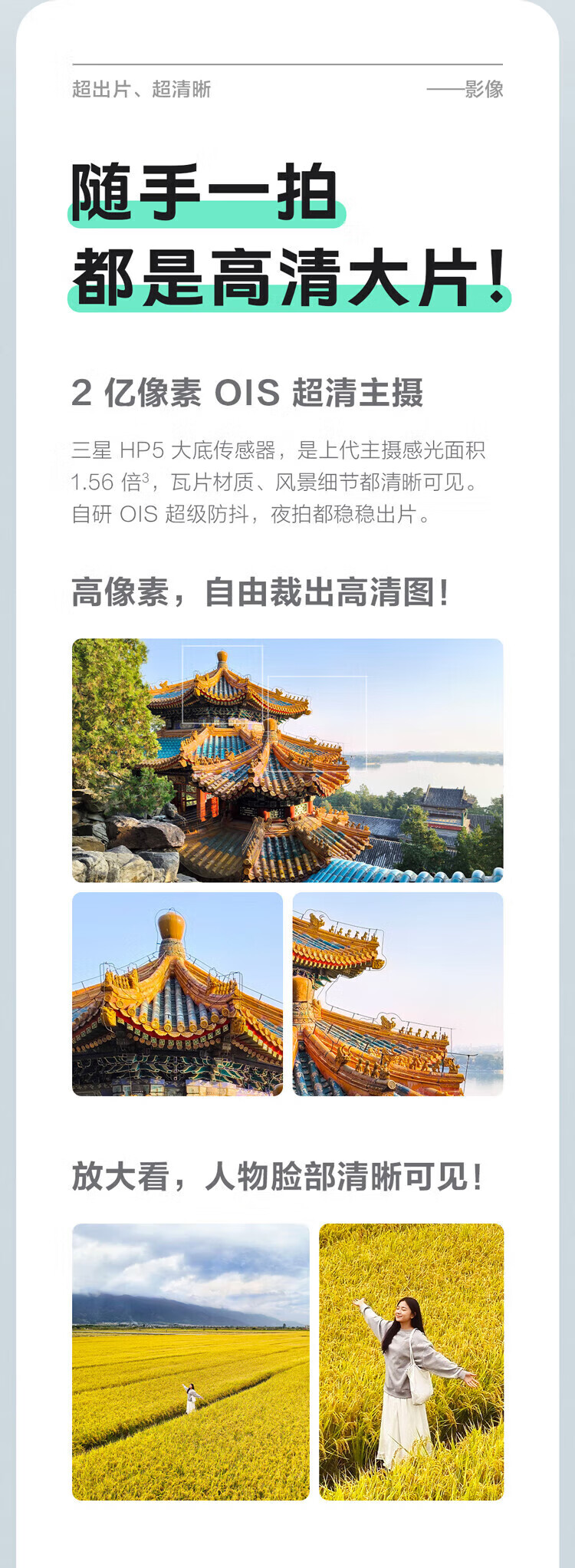 这款手机最惊喜的是拍照能力!2亿像素主摄果然名不虚传,白天拍风景连树叶的脉络都清晰可见,逆光场景也能保留丰富细节,晚上拍夜景噪点控制得很好,路灯下的建筑纹理都能拍清楚。前置3200万像素自拍也很绝,美颜效果自然不夸张,能保留皮肤原生质感,睫毛根都看得清清楚楚。AI消除功能还能一键去掉背景路人,出门旅游拍照再也不怕抢镜了。 续航绝对是最大亮点!7000mAh超大电池太顶了,我重度使用一天(刷抖音3小时+微信聊天2小时+导航1小时)