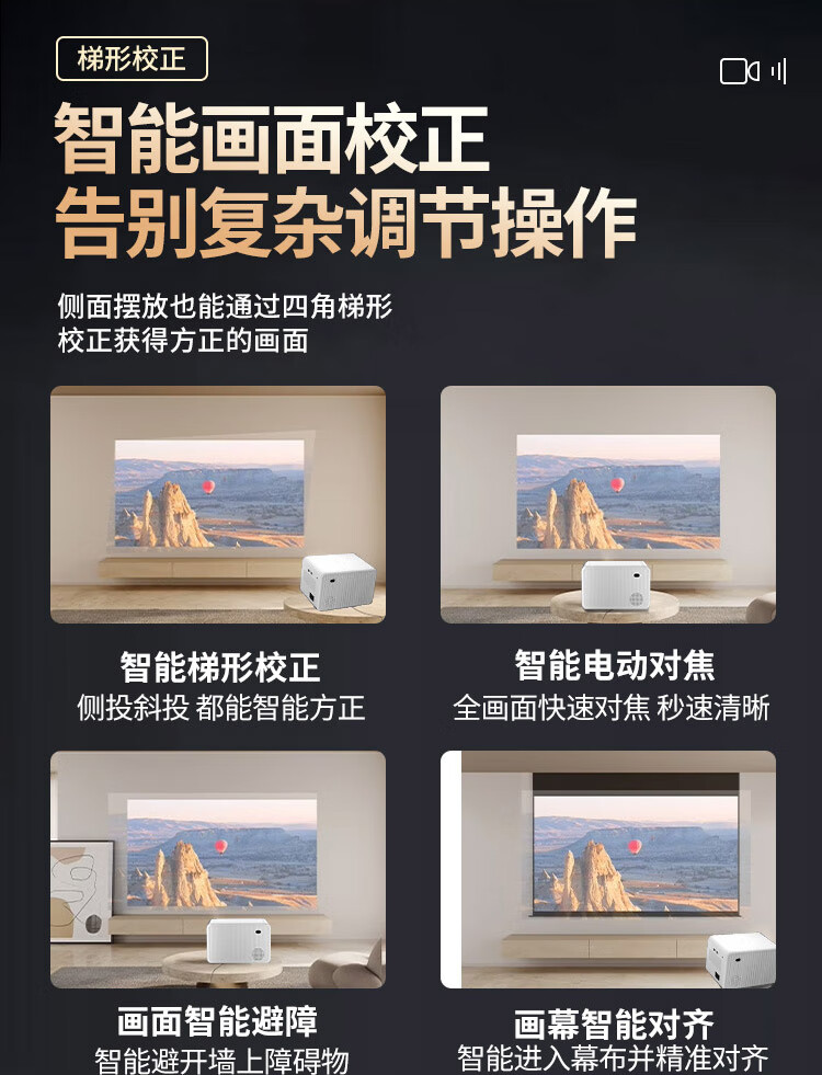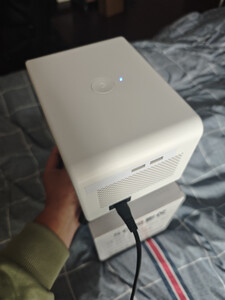 操作还挺简单的,可以自己梯形校正,试了一下,可能画质没那么好,但是胜在性价比高,音效还是挺好的。目前还没有外接过设备,用APP直接投屏还是挺方便的。挺小巧的,胜在可以想在哪看就在哪看。