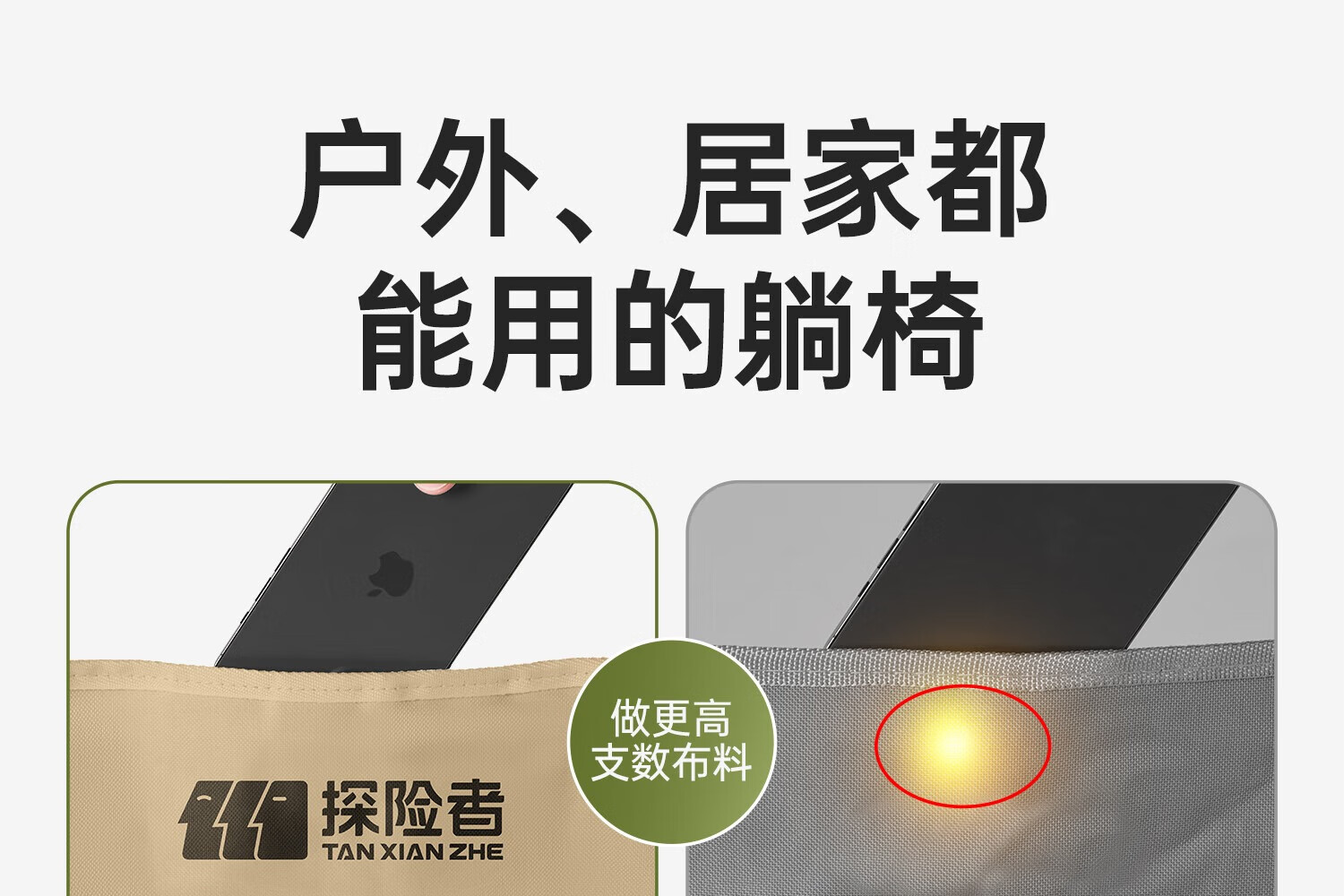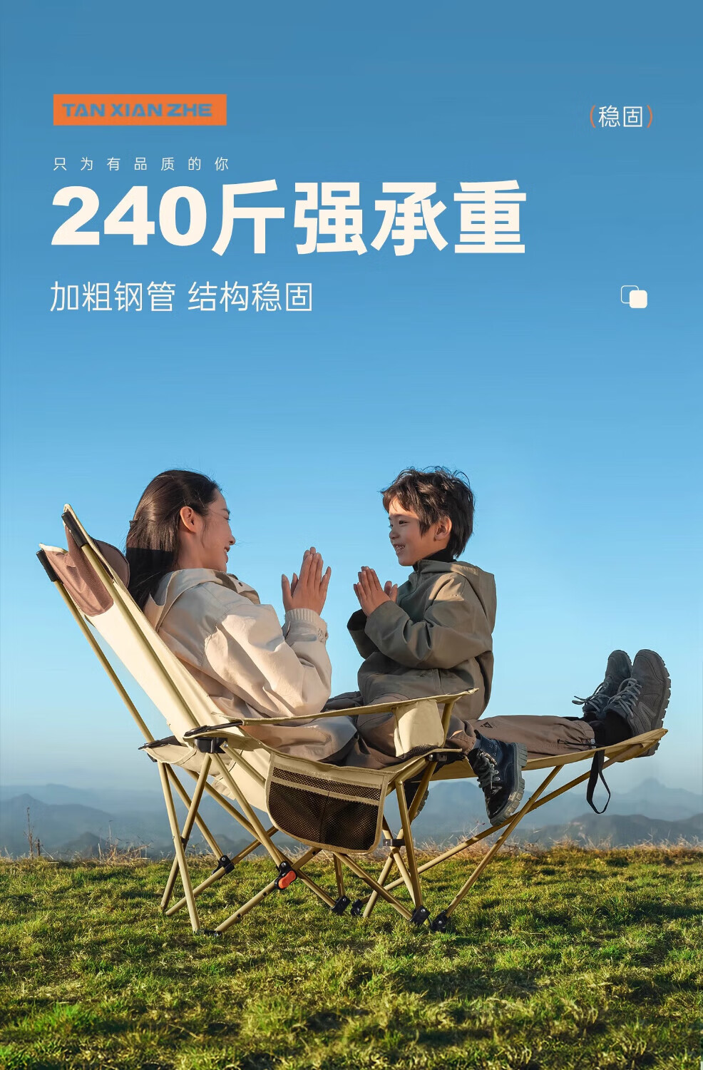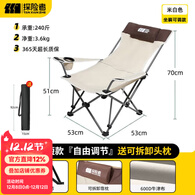 探险者折叠椅户外躺椅便携式单人靠背露营椅子休闲椅扶手椅折叠午睡床 卡其-加长脚垫躺椅【四挡调节】