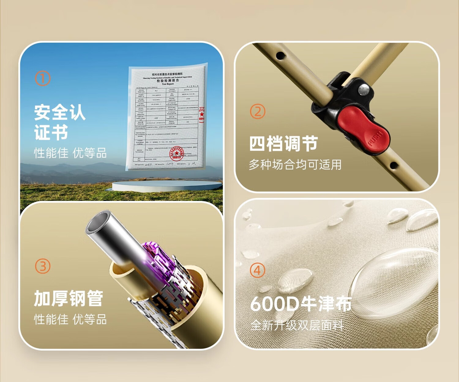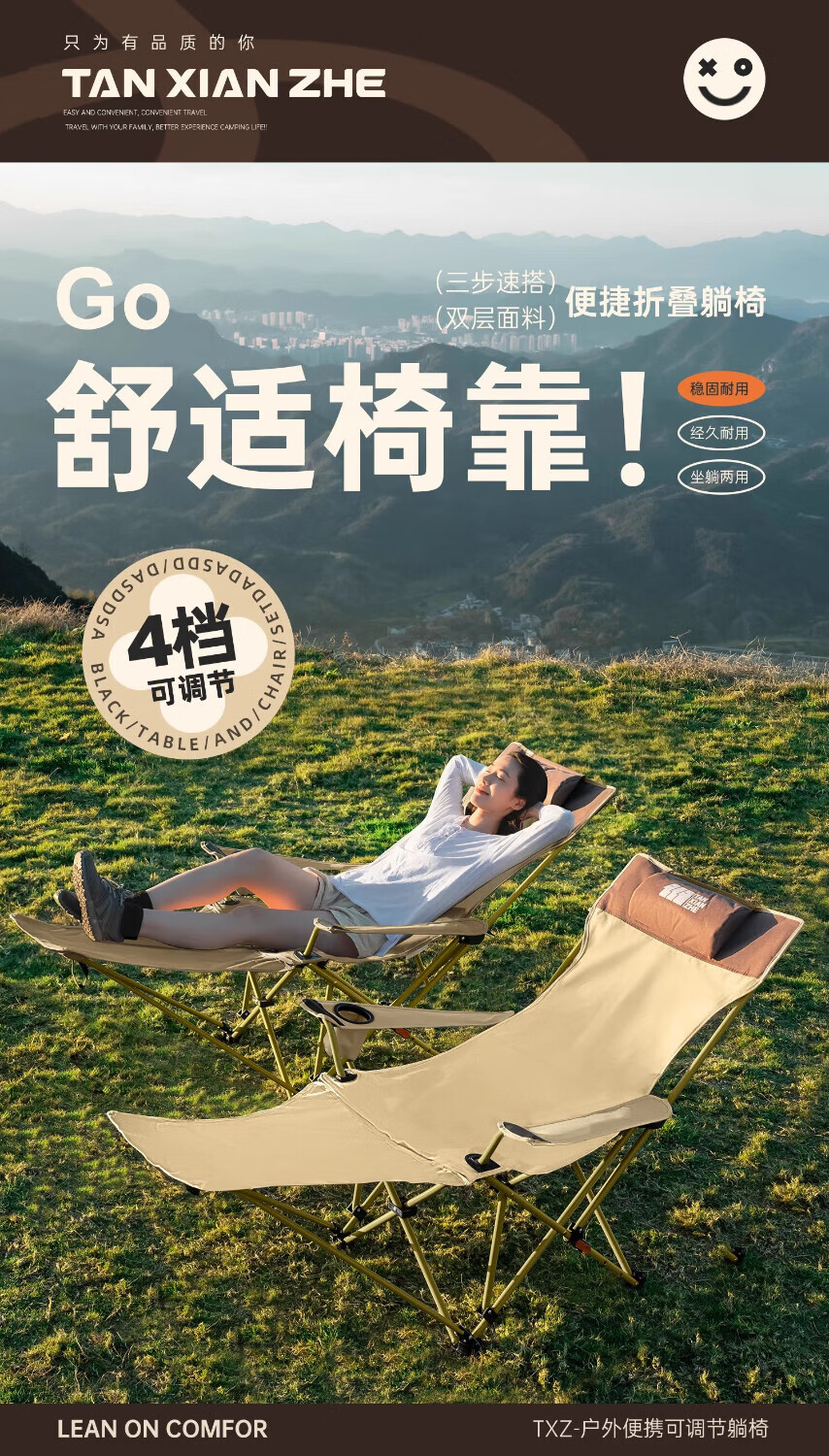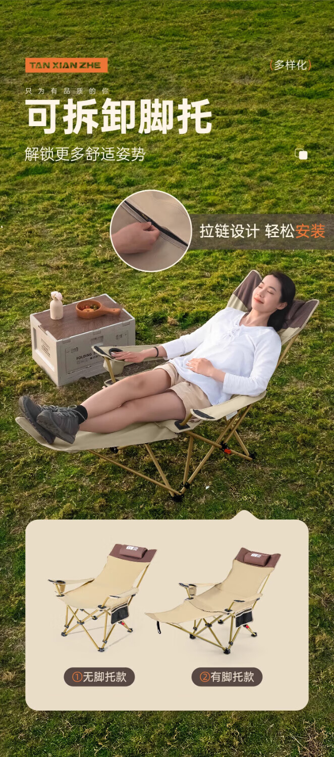 清系户外折叠椅露营沙滩躺椅钓鱼椅四档折叠家用商用便携可折叠高背凳 【4档调节/坐躺两用】卡其色