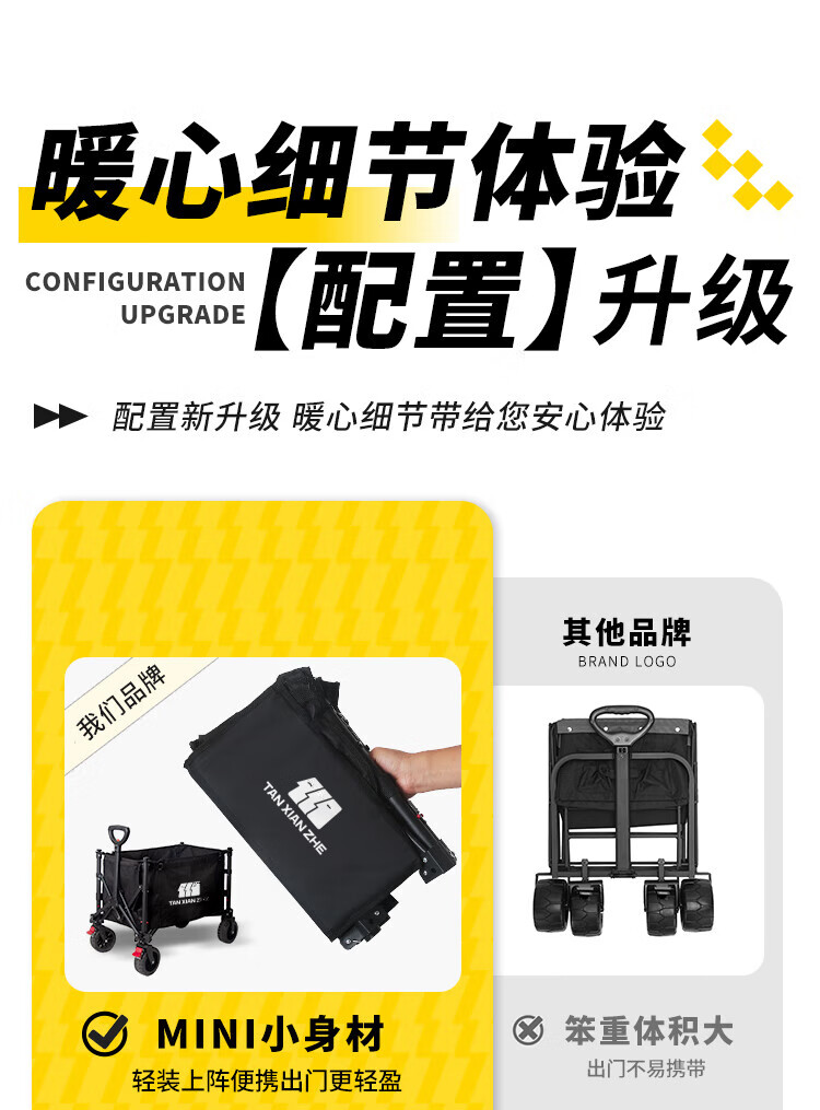 选露营车看了很久,一直想找个小巧一点的,无意间看到这款,正合我意。质量好,空间够用,最重要的是重量轻,方便收纳,十一二斤,比其他露营车轻了不少!轮子还可以拆卸,一点也不占空间。可以放后备箱随时取用