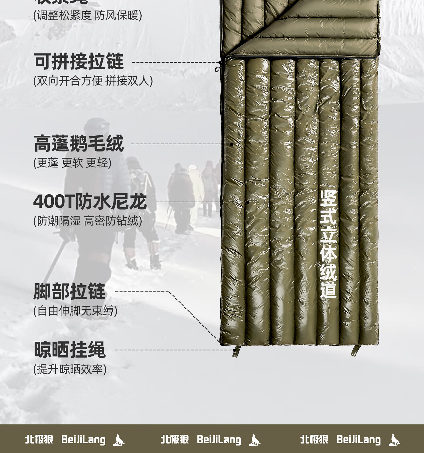 北极狼(BeiJiLang)羽绒睡袋轻量化鹅绒成人户外露营旅行便携式打地铺车载用午休被子 【加宽85cm600g】灰色【高蓬鹅毛绒立体绒道】-4~-1℃