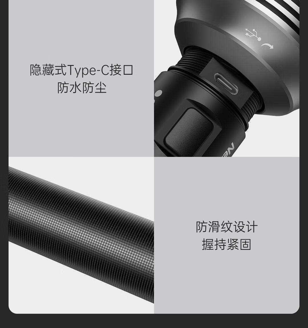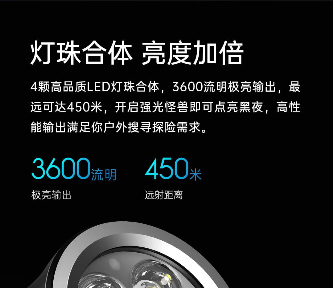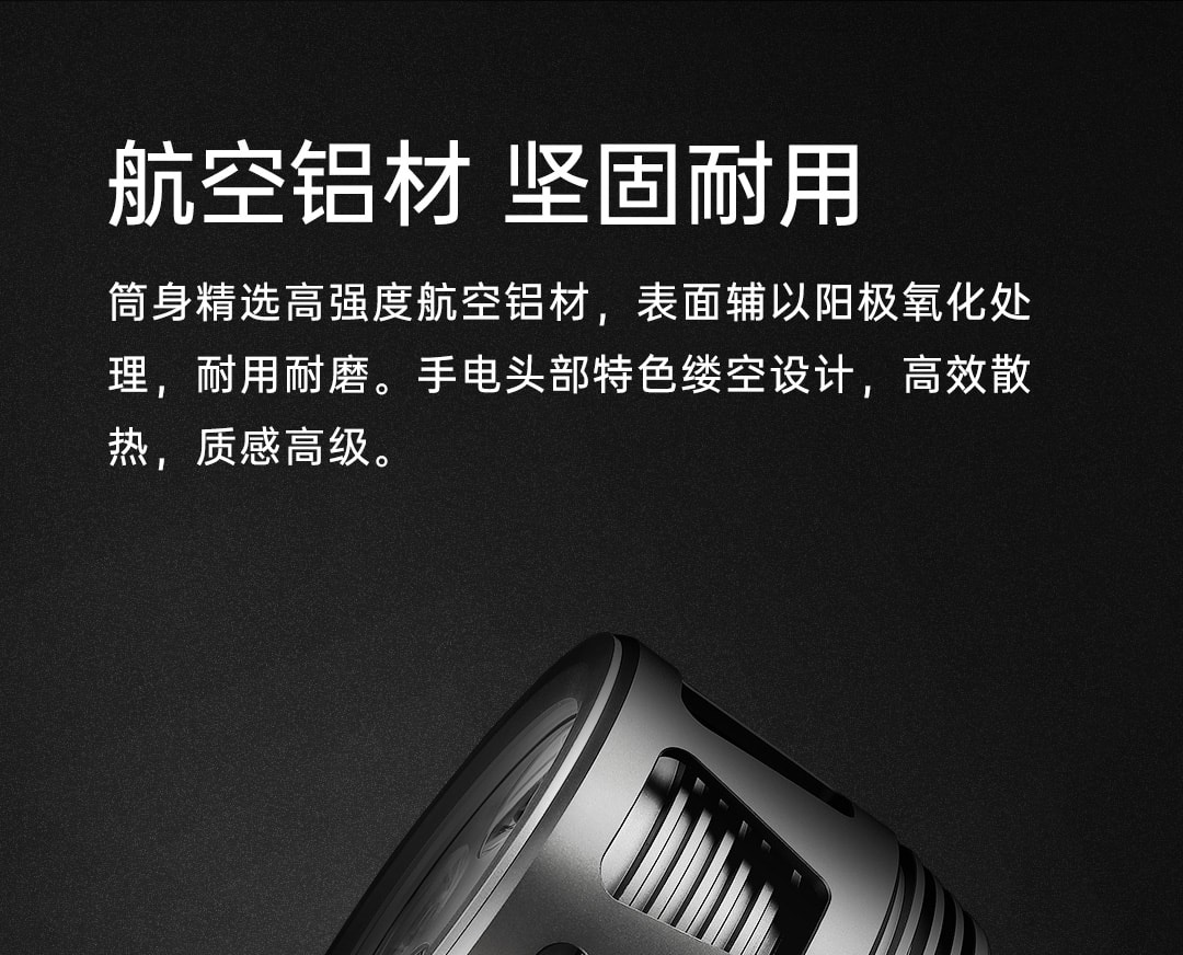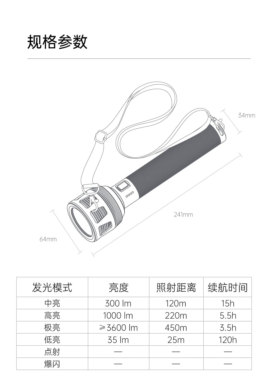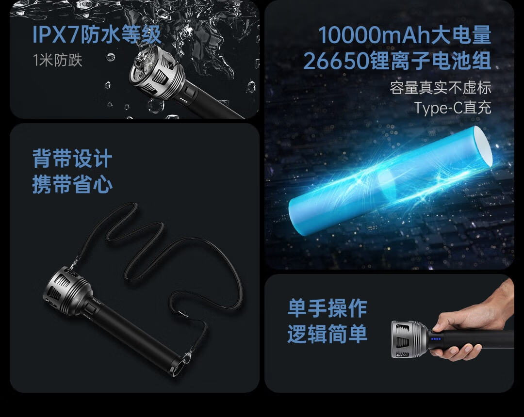 产品材质:全金属材质。黑色氧化工艺。手柄处防滑处理。 光照强度:4档可调节,爆闪启动方便快捷。 续航时间:10000毫安内置电池,电池不可更换。续航时间有待观察。 产品重量:650克 电源类型:内置电池,不可拆卸更换。 其他特色:手感很好,电池容量高,C口充电,整体做工不错,对得起这价格4颗灯珠。