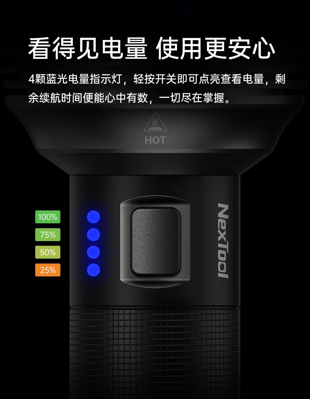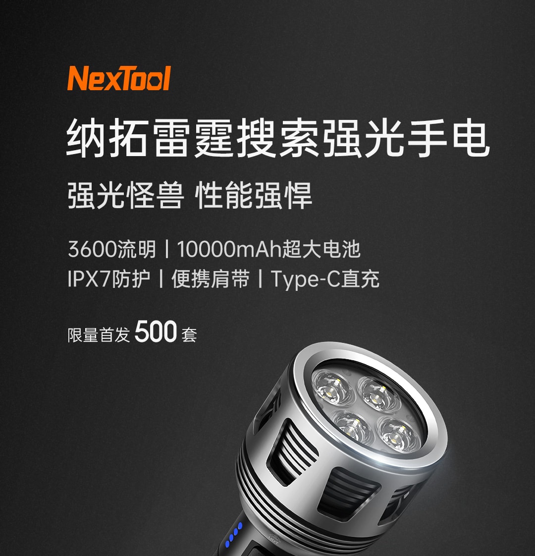 纳拓(NexTool) 雷霆户外强光手电防水超大电容量远射应急手电筒3600流明 黑色