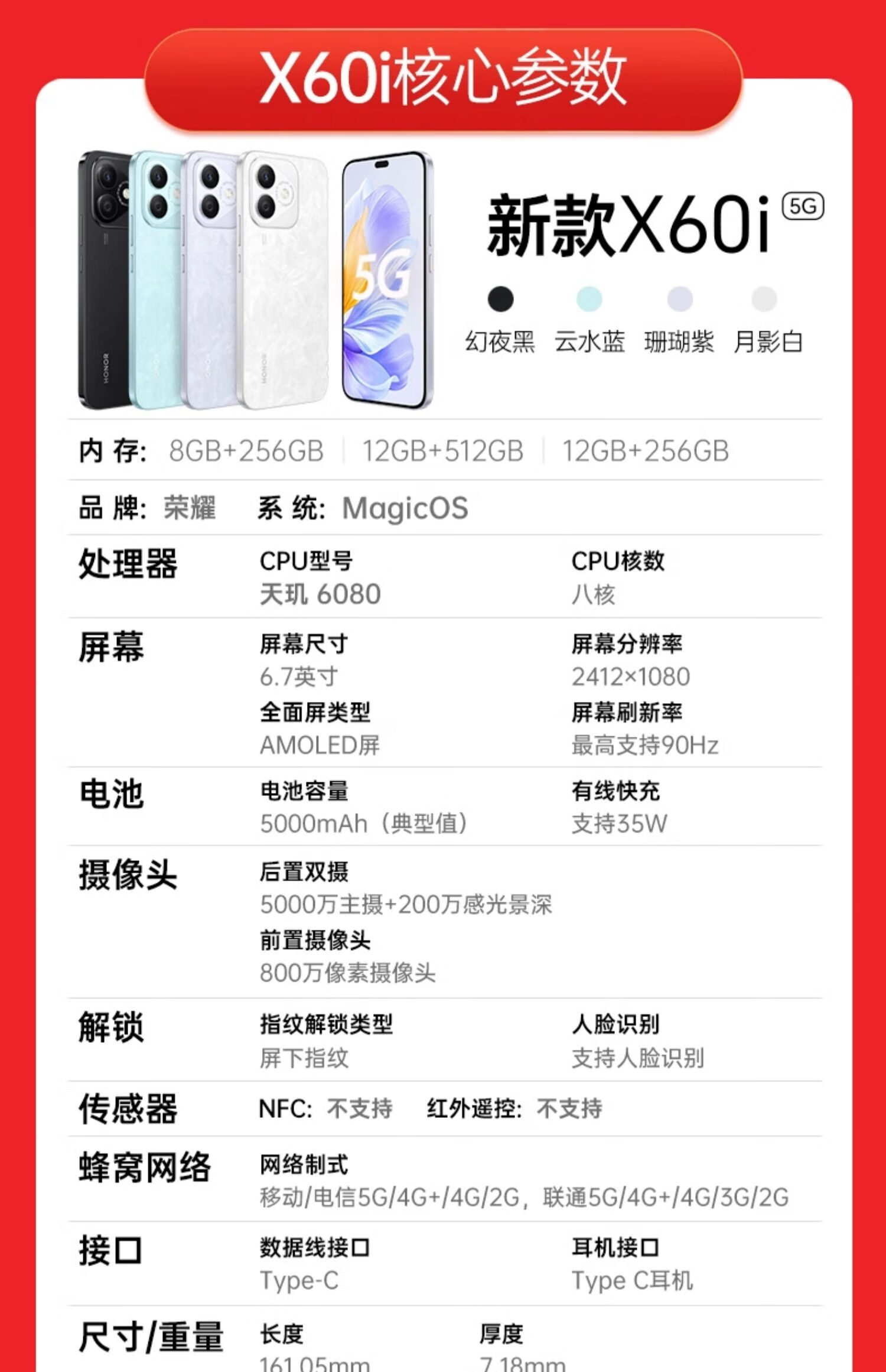 HONOR荣耀展机X60i 5G智能手机 5000mAH大电量 6.7英寸大屏 正品 云水蓝 12GB+512GB 激活单机+品牌快充+店保一年