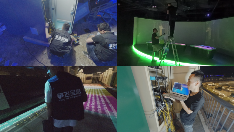争飞技术团队研发的全息投影无需其他介质,用户可以直接用手脚与投影区域上的虚拟场景进行互动。