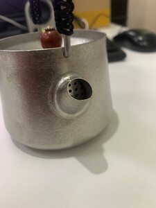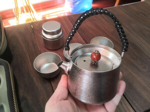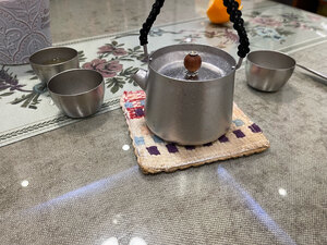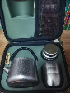 很精致,比想象中小一点,壶是单层的,杯子是双层的,一壶大约四杯样子,里面的茶网也是钛的,整体很轻,不过包包有点分量。