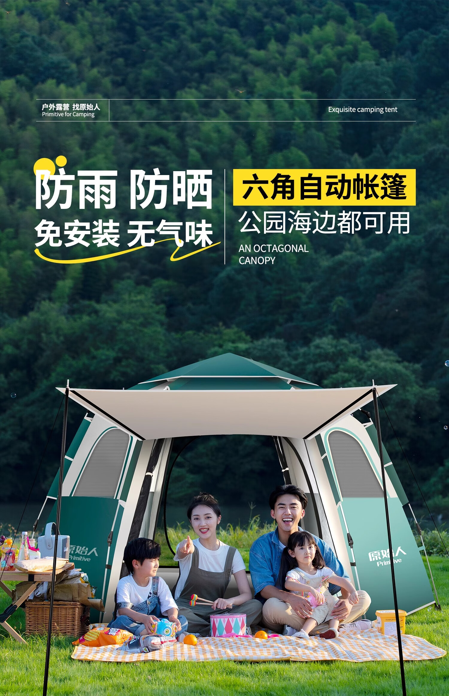 原始人帐篷户外便携式折叠全自动儿童帐加厚防雨露营装备野外野营 墨绿大号+防潮垫+野餐垫+吊床