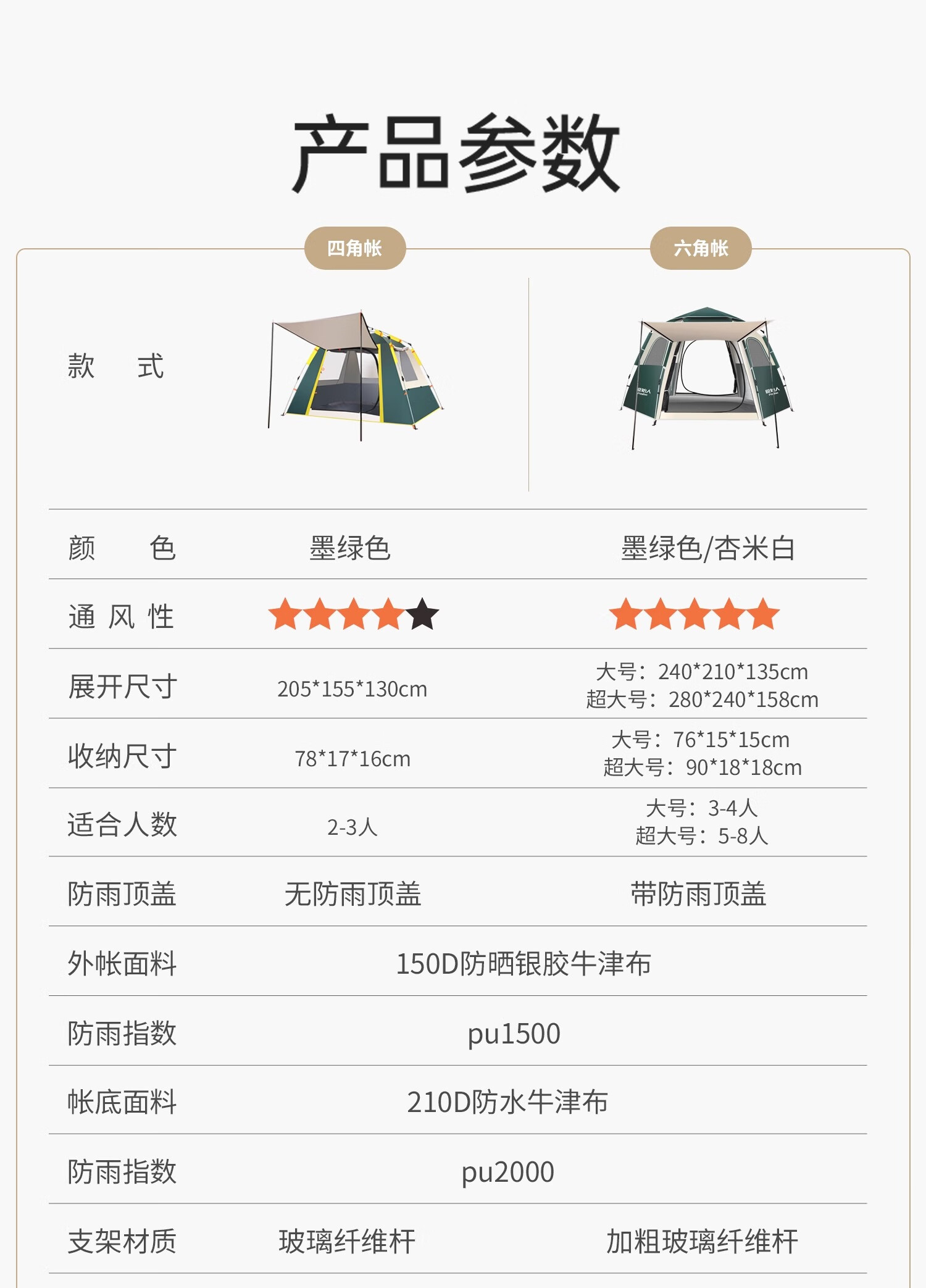 容纳人数:4-5个人没问题 透气效果:4面都有窗户,透气性很好 便携性能:很方便,一展就开 防水效果:没试过