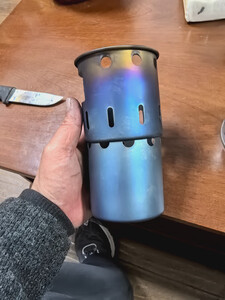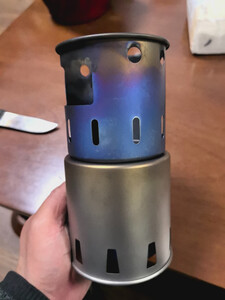 很精致的东西,烧木头的时候,只要不放上水壶,就燃烧得很充分,一旦放上水壶以后,就会有很多的烟。整个的设计比较合理的,很小巧,放的柴火很容易燃烧。