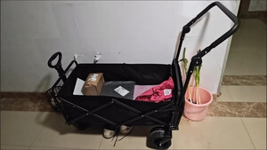 小车收到了,质量非常好,车轮和推手都非常顺滑,车轮还很宽,可以应对各种路面,车子大小合适,承重强,可以装很多东西,折叠起来还不占空间,非常满意