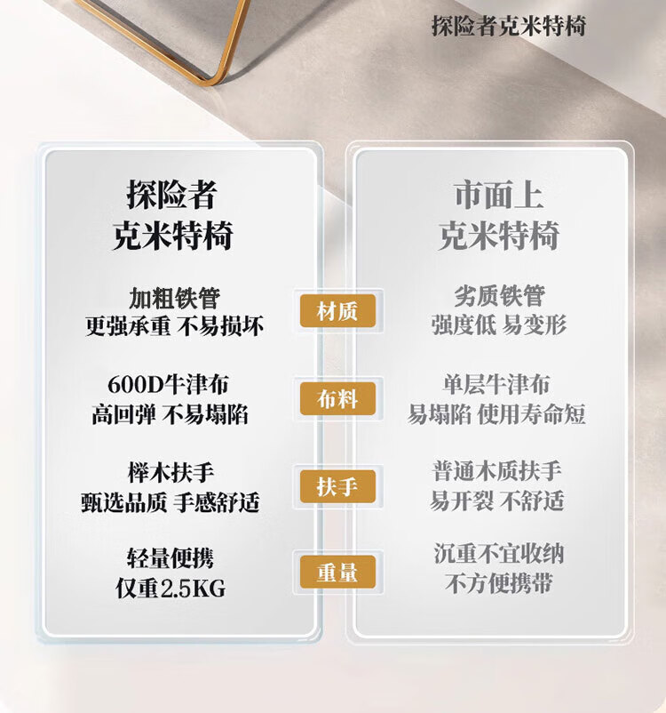 克来特户外携带方便,不一样的体验感受全新升级600d的牛津布。承重性强,最高可承重240斤,舒适、体贴、可靠,牛津布耐用不变形、复合PE 涂层耐磨,防水,透气,久坐不闷热,防水耐磨,抗撕裂,粗的铁管,更强的沉重、举目扶手手感舒适,轻量便携仅重2.5k8。发货速度很快,包装很好,下单后第二天就收到了、质量也不错、比之前买的其他牌子还便宜,坐上去也很舒服,放在家里户外都可以用,折叠起来携带方便。