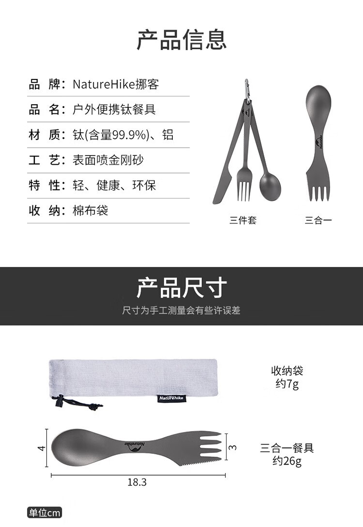 商家发货很快,包装非常好,一直都喜欢在购买挪客的产品,每次入手都不会失望,这款全钛合金餐具,外出旅游必备,刀叉勺齐全,做工精致,钛合金主打就是耐腐蚀,很轻巧,大小很合适,有活动的时候价格实惠