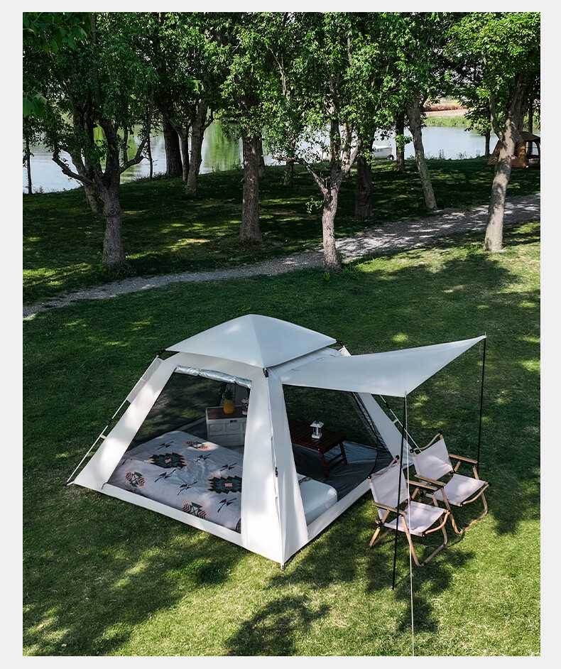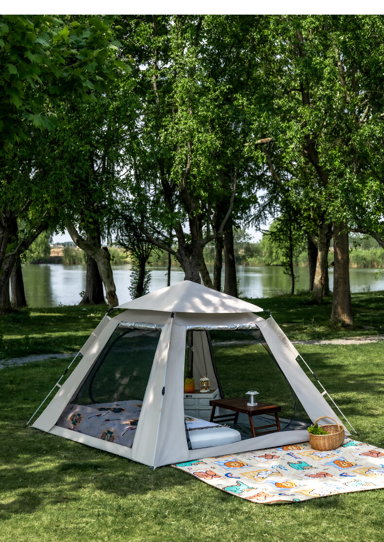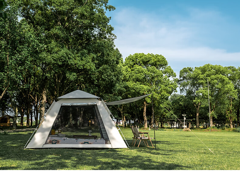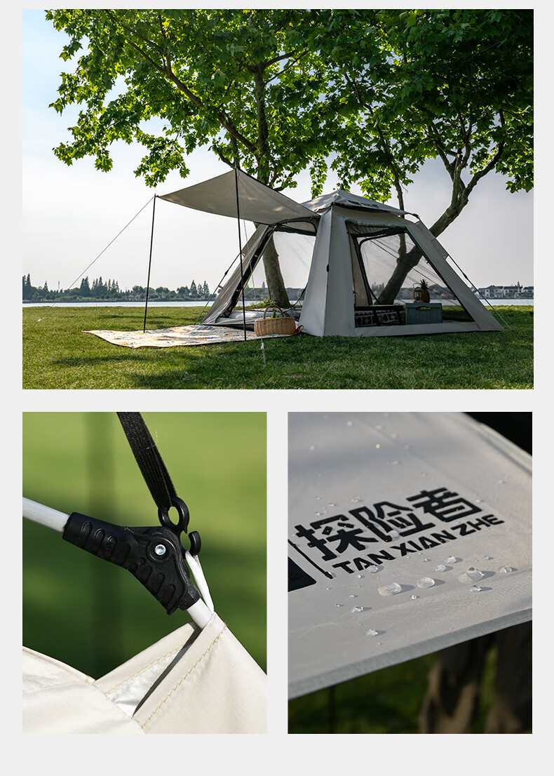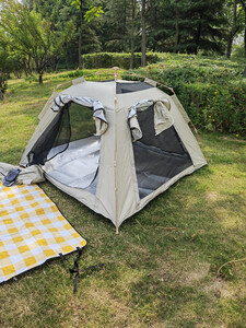 帐篷非常好安装,四面都能打开体验感很棒。挡风防风效果不错,款式超级好看。商品没有瑕疵,材质结实,收纳袋也很棒。